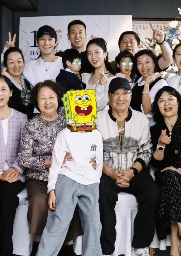 尤其是在大合影裏,小海綿長腿搶鏡。他被奶奶攬在懷裏,旁邊是爺爺,一看就是全家人寵在手心裏的寶貝。