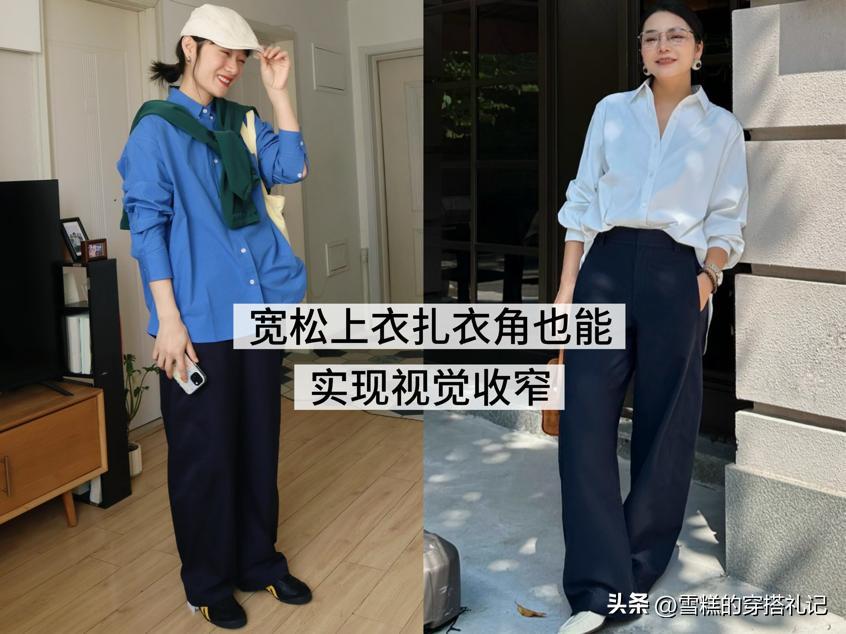 如果想穿寬鬆的上衣,比如oversize衛衣、寬鬆襯衫,也可以通過“打結”“塞衣角”的方式收束上半身,或者內搭和外套寬緊對比來實現顯瘦效果。
