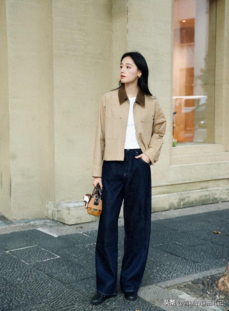 (2)日常休閒風:短款上衣+丹寧/棉料彎刀褲,慵懶顯氣質