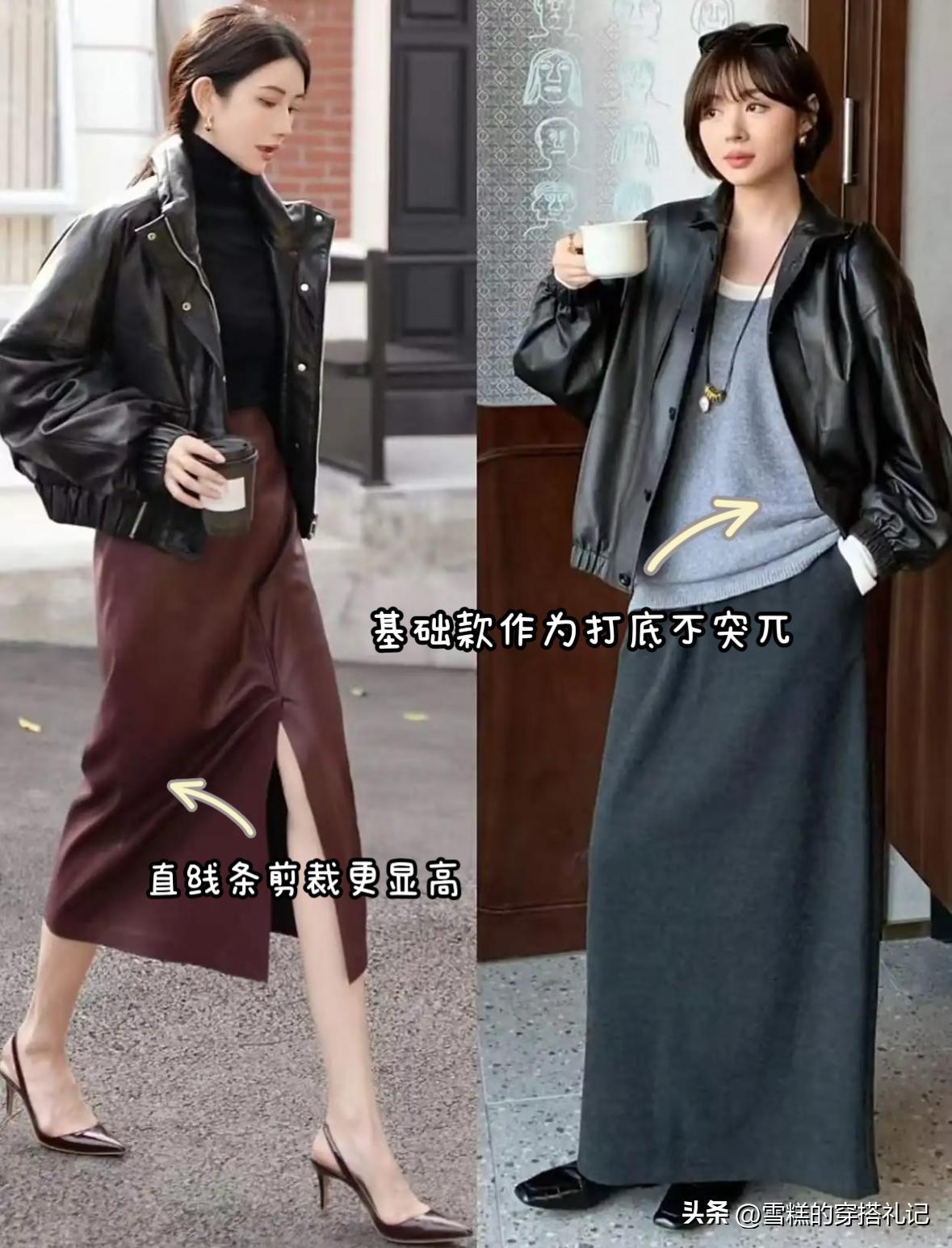基礎款式的打底衫或者毛衣作爲打底,疊穿一件黑色廓形短款皮夾克,下身搭配線條感筆直流暢的直筒裙,視覺上能夠縱向拉長身形比例,氣場全開!
