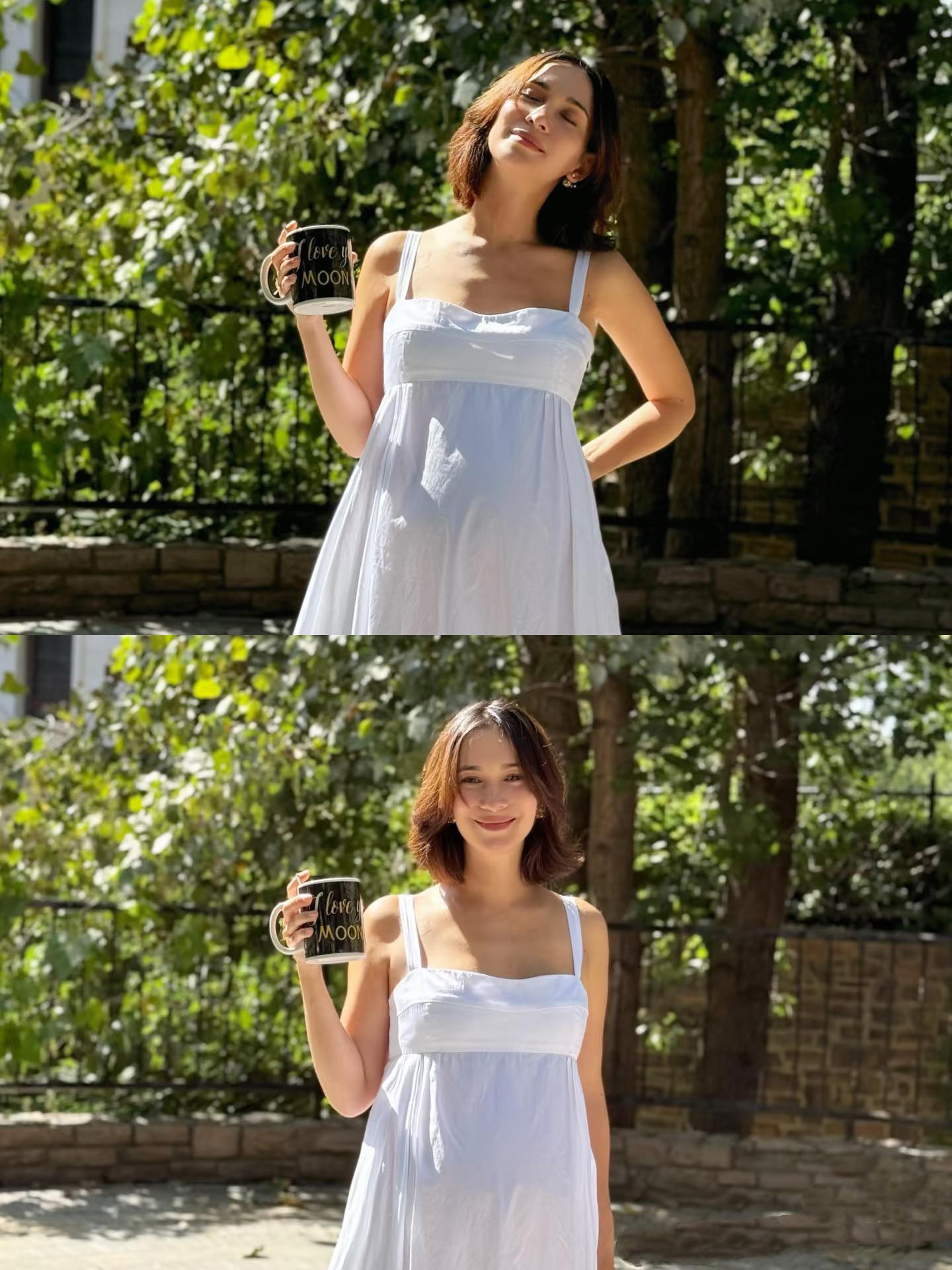 盧靖姍整個孕期,基本沒有長什麼肉。他穿着吊帶裙的時候,手臂還是很纖細、肩頸線也超完美,還能看到優越的鎖骨線條。