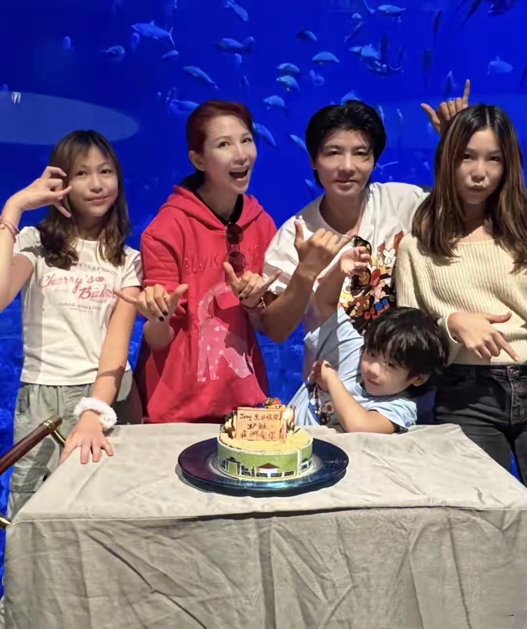 遊玩結束後,就進入到親生流程了。一家五口在一起拍照片,就連生日蛋糕都特別有趣。6歲的魚蛋站在爸爸媽媽中間,彎着身子充滿了童趣。