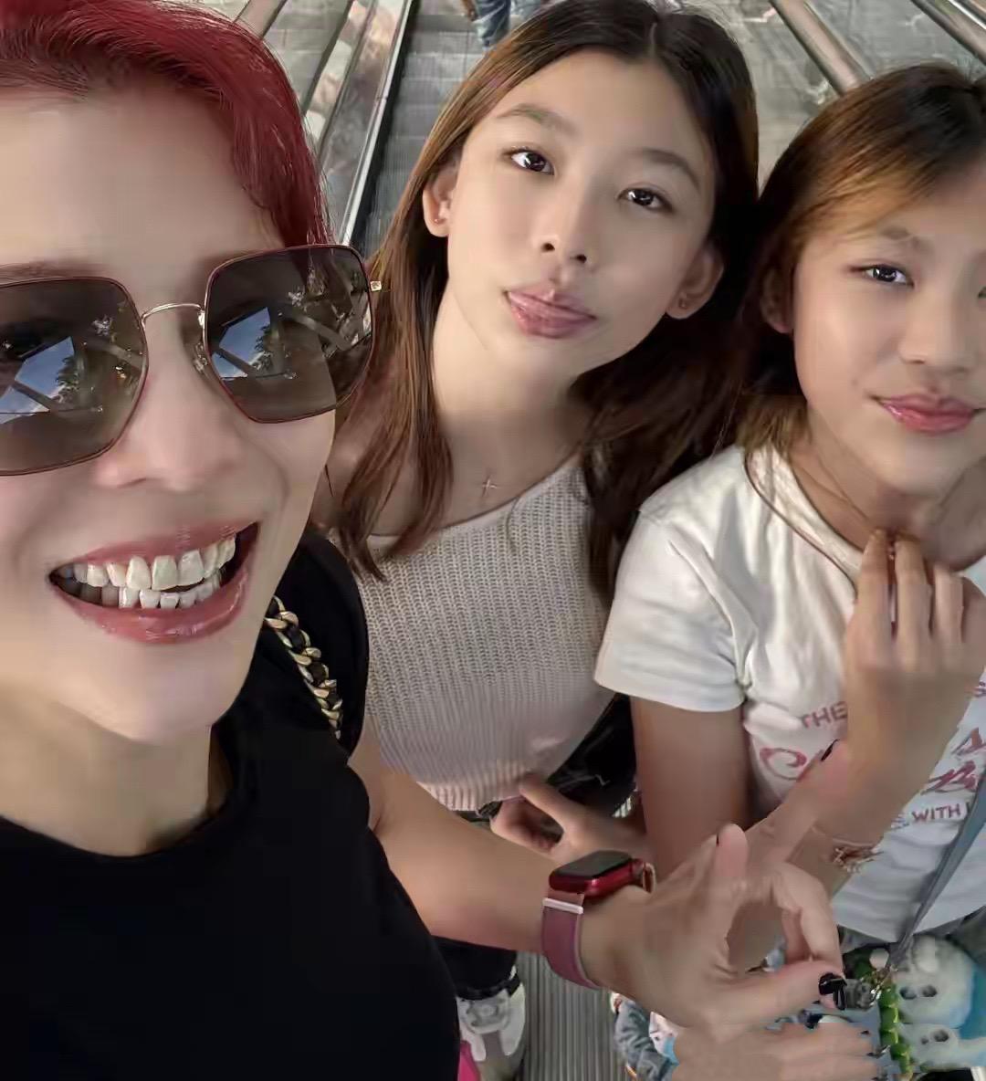 果然是女大十八變越變越好看,蔡少芬的兩個女兒簡直長成了媽媽翻版。她們都染着黃色頭髮,還化了淡妝,有一種比較成熟的感覺。