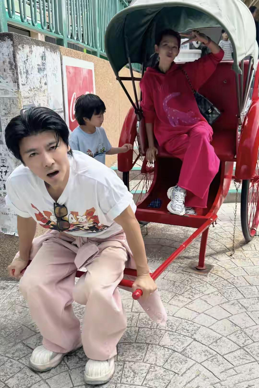 儘管張晉身體不太好了,但爲了陪老婆兒子玩得開心,還是特別賣力。蔡少芬坐在一輛紅色的小洋車上,張晉充當起“車伕”。