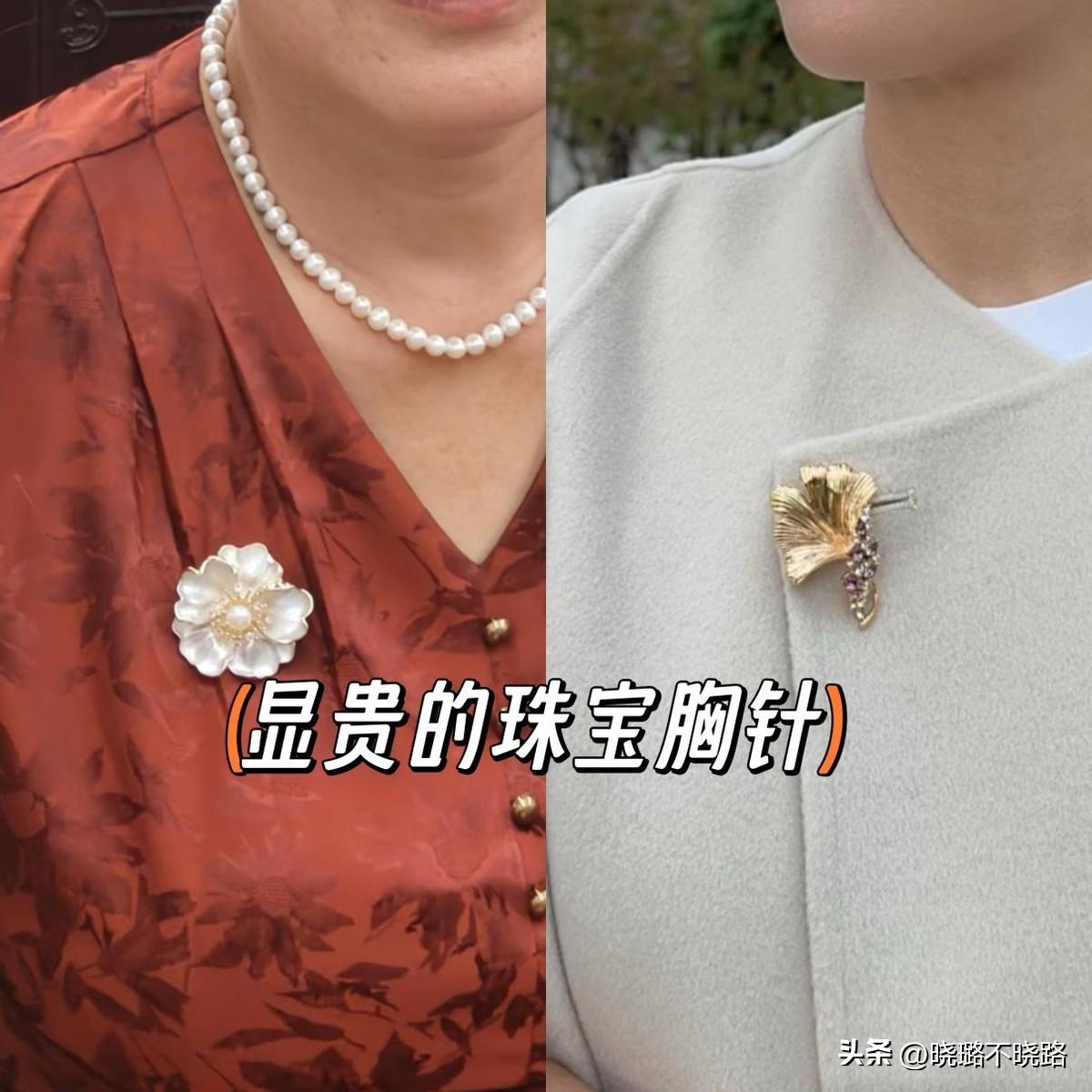 除了珍珠首飾以外,珠寶胸針也是中老年女人的必選項,一枚胸針,點綴於胸口、領子、衣襟處,既不會喧賓奪主,又能夠達到“四兩撥千斤”的效果。