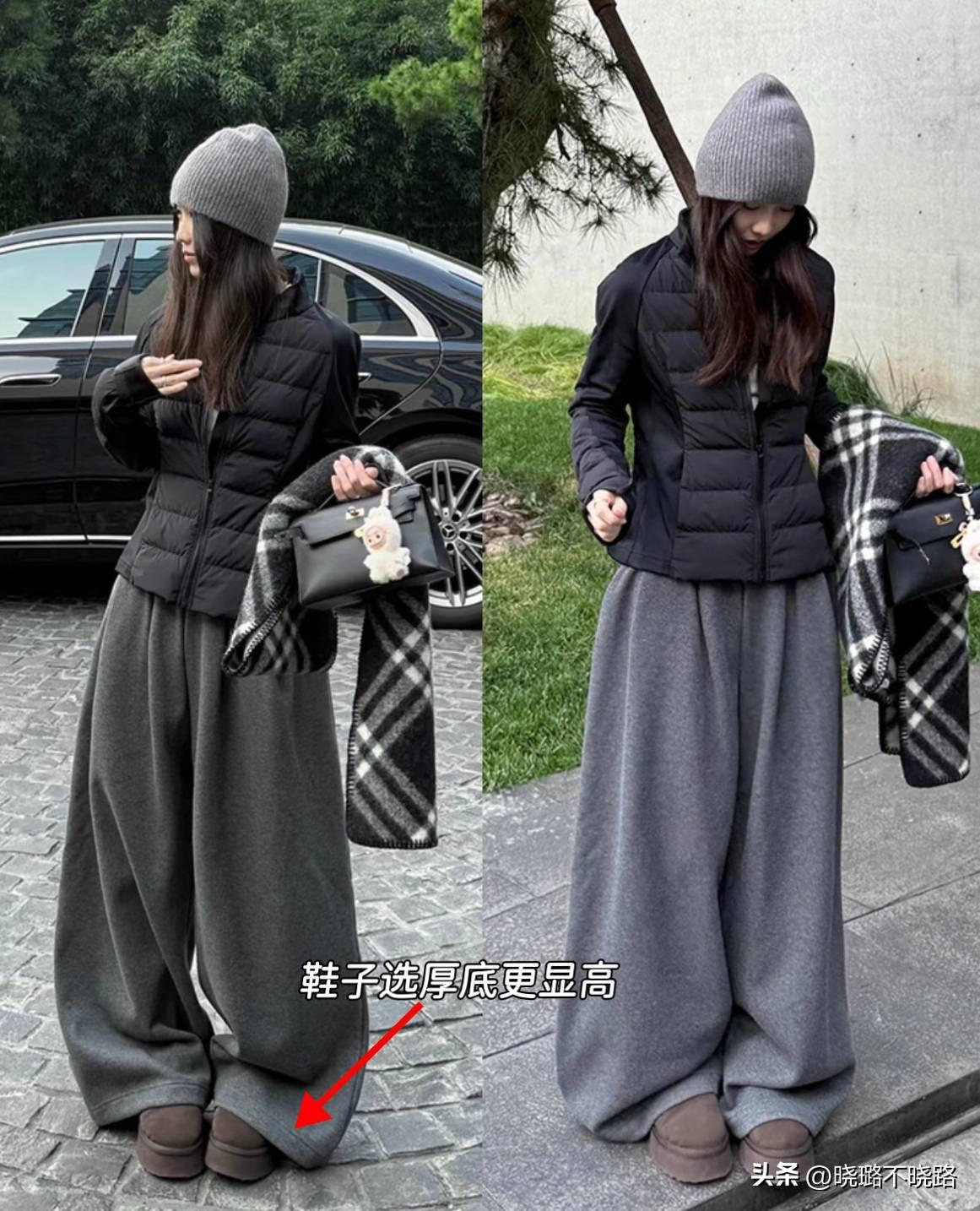 排骨羽絨服現在穿的好看,下裝就要“寬一點”,換成闊腿褲、彎刀褲、喇叭褲,拿捏“鬆緊平衡”的狀態,就能輕鬆優化身材比例。
