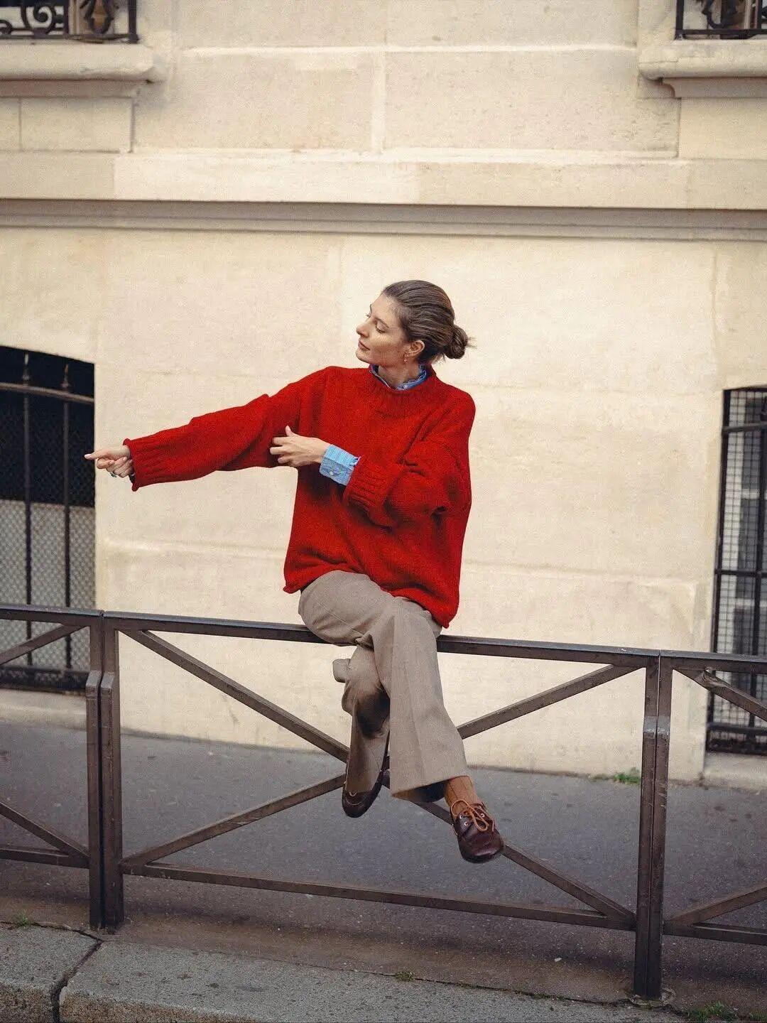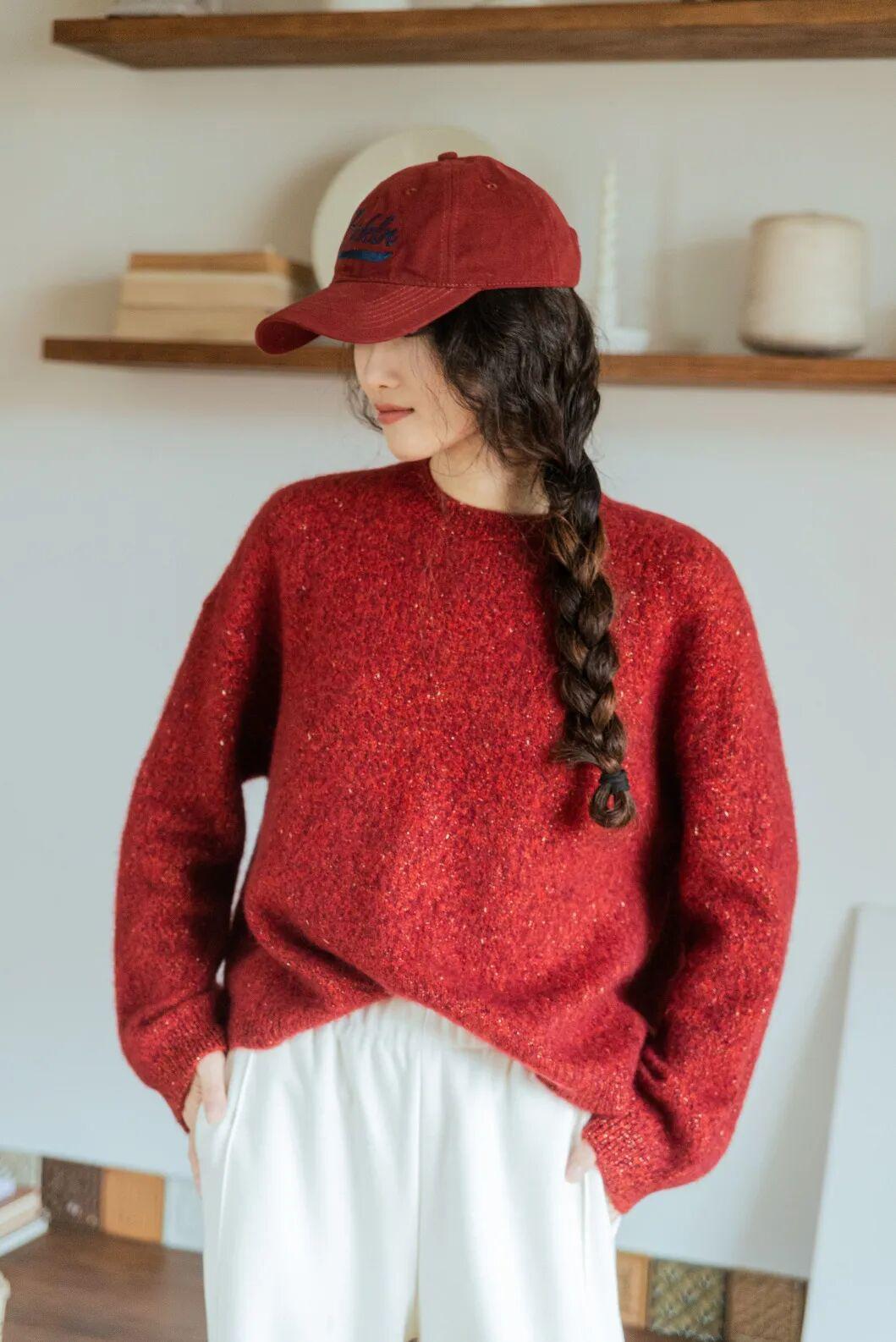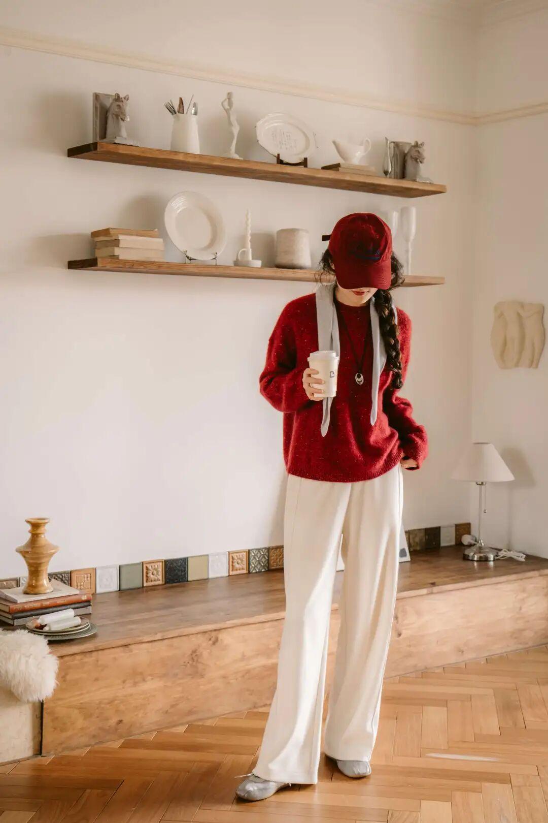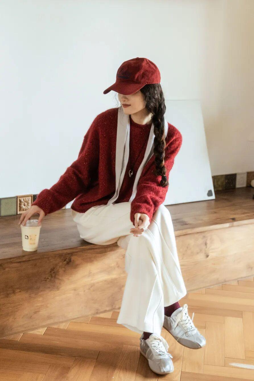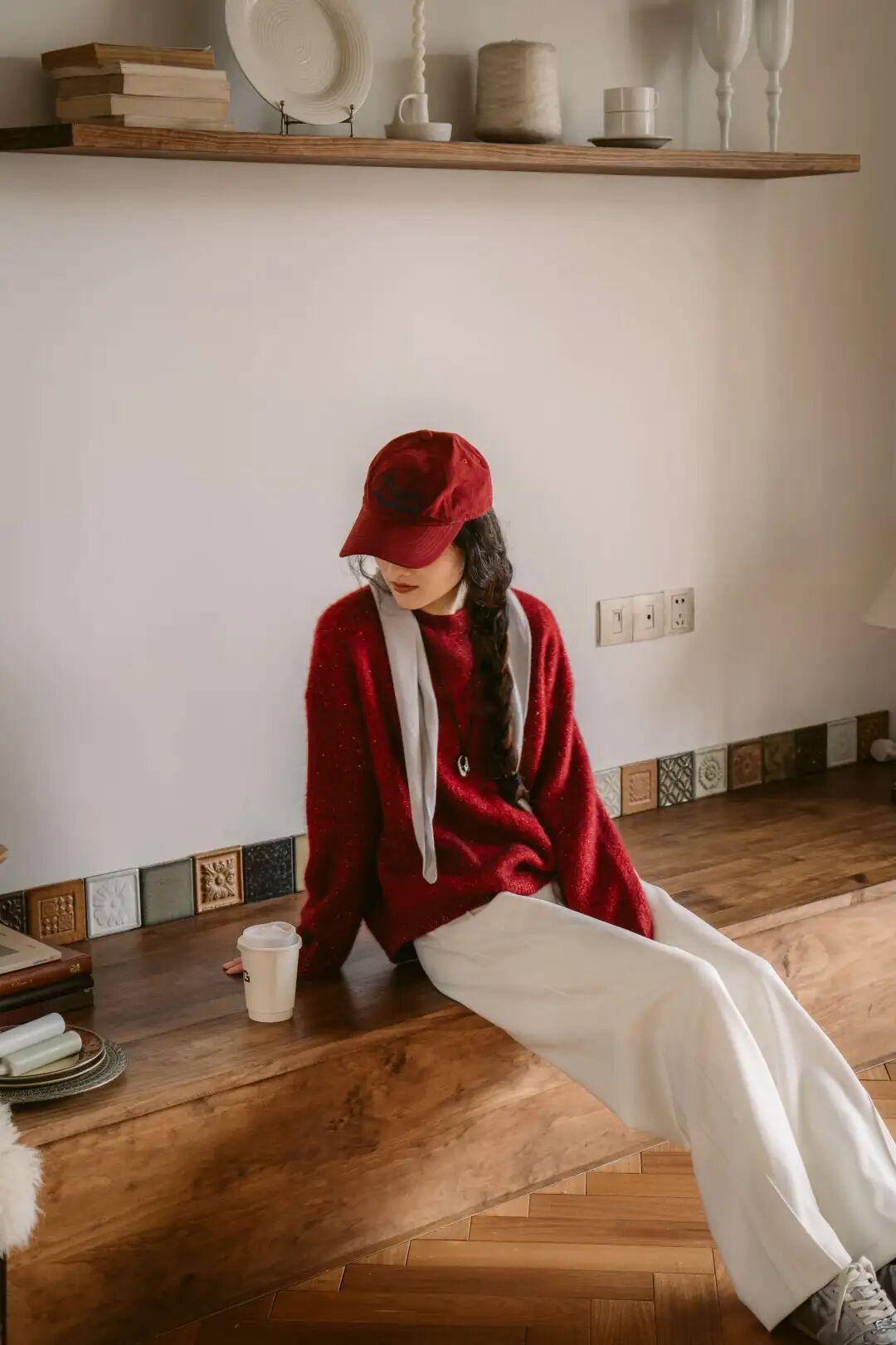 而緋紅色,也不是普通的正紅,而是融入了中國紅、橘色和葡萄紫,聖誕、過年穿都超應景~▼
