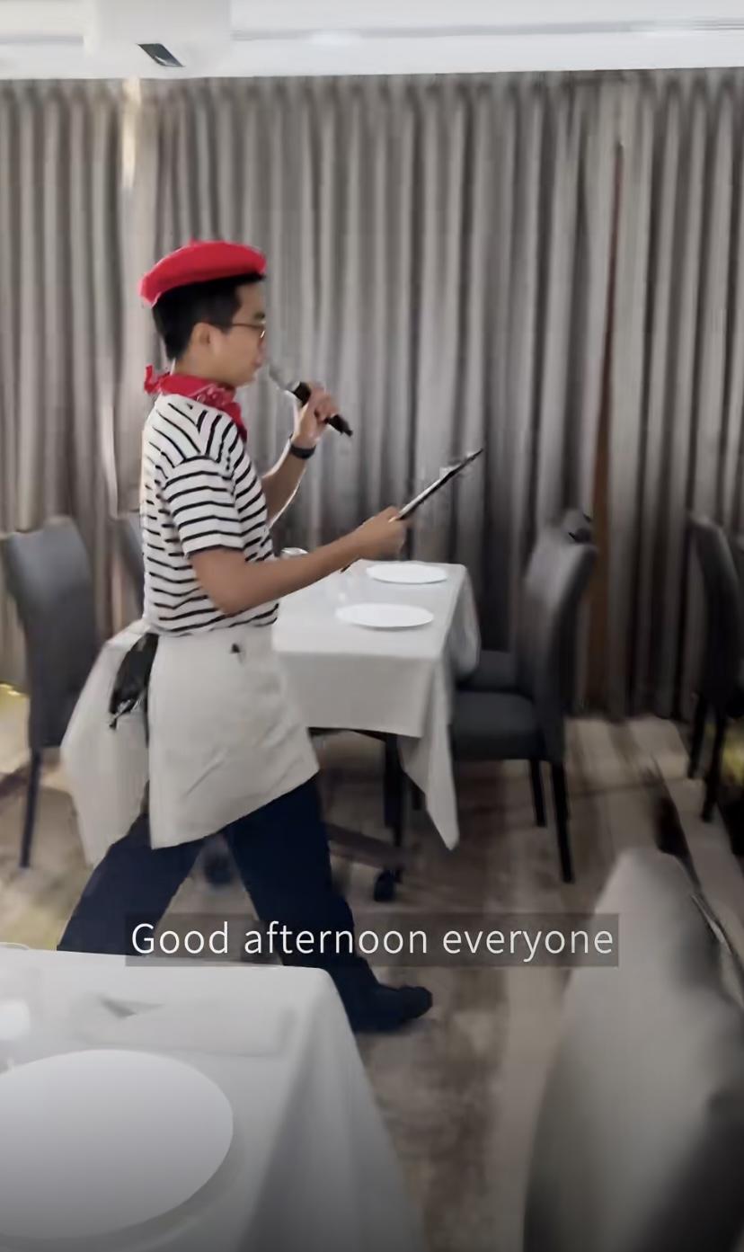 最有特色的就是用餐體驗了,何超蓮特意帶着老公竇驍來喫漂亮飯。服務生穿着條紋衫、帶着小紅帽,看着很有喜感。