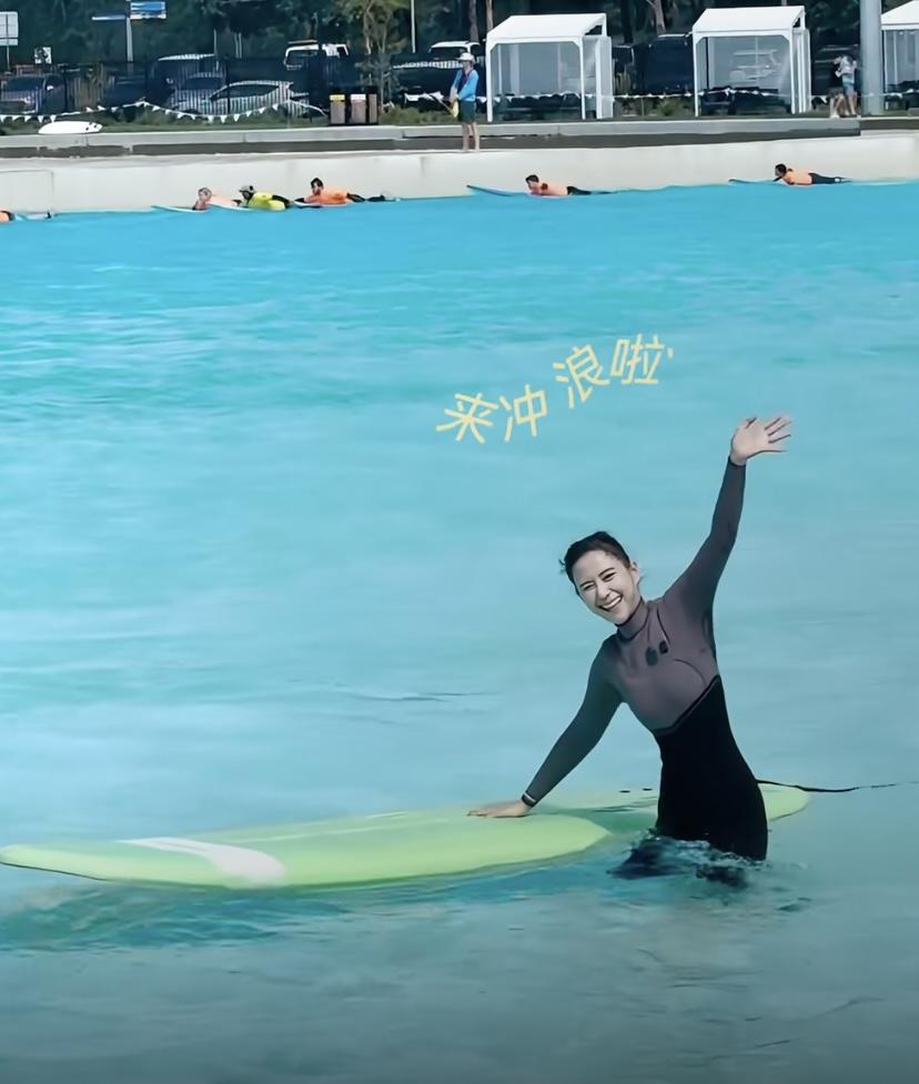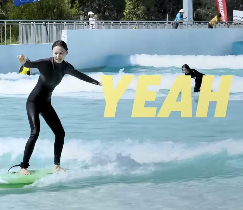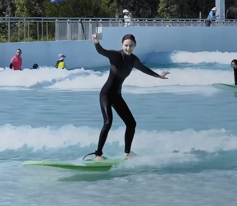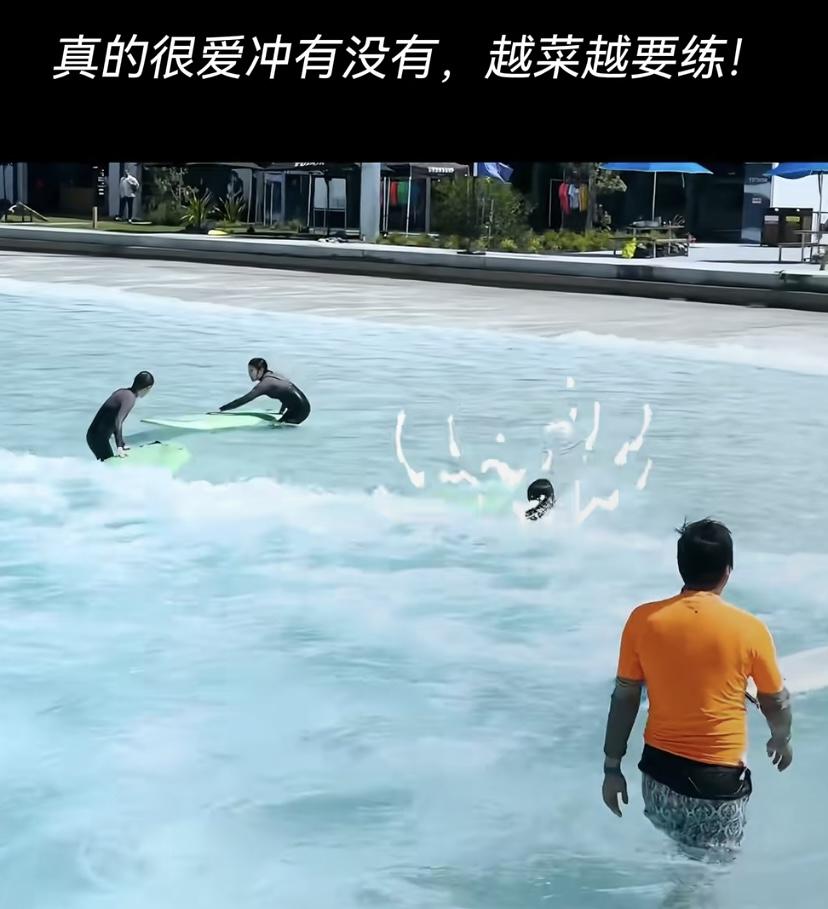 看着何超蓮落水的樣子,真的是太有趣了。衝浪就是一種很刺激的運動,不過這種人造的衝浪環境,安全係數還是非常高的,水位不是很深,所以即便是很菜也可以放心玩耍。