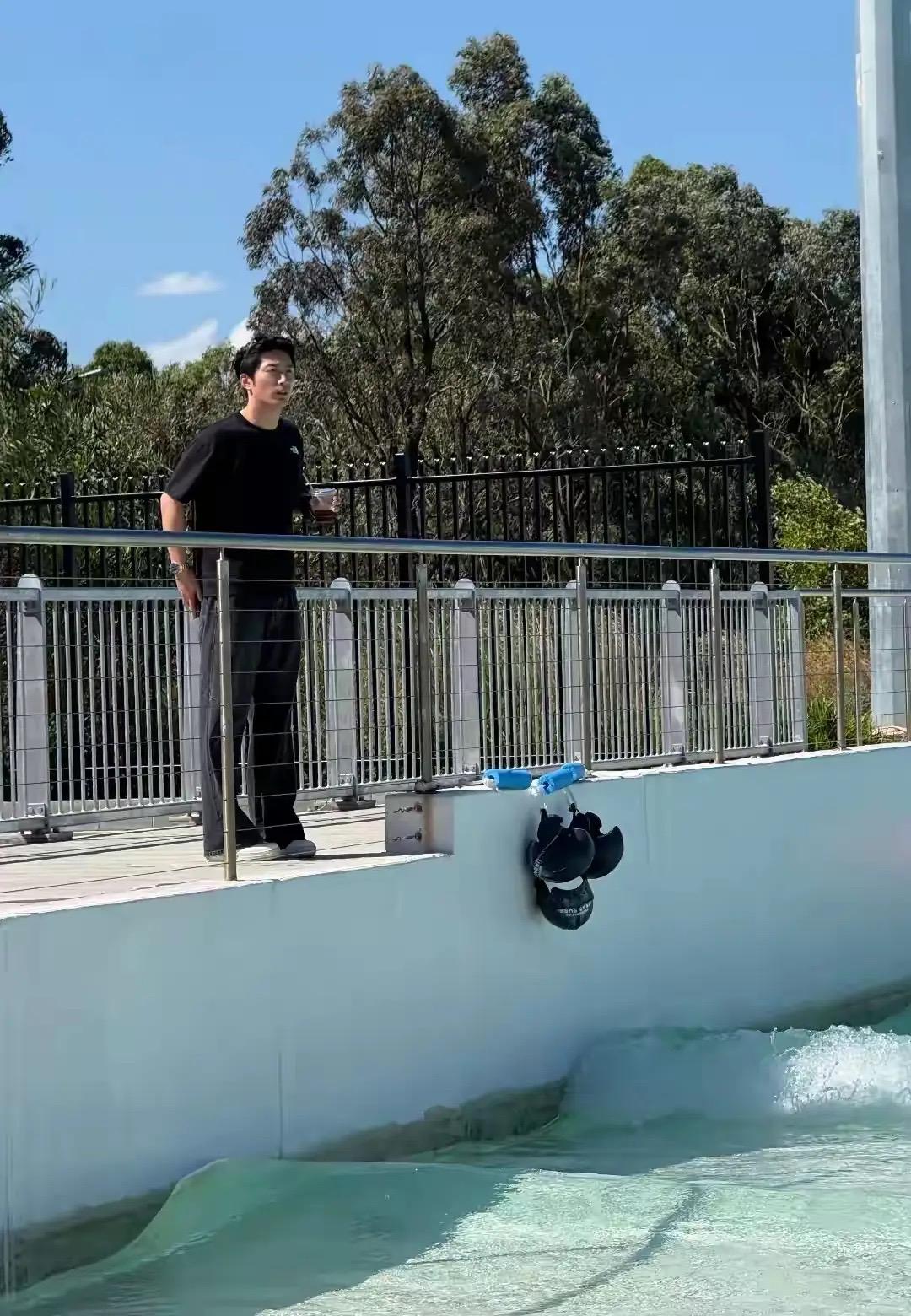 當天天氣不錯,竇驍站在岸上看着老婆。他穿了一身黑色衣服,看起來神情有些緊張,大概竇驍不太喜歡這種刺激的運動。哪怕是在岸上看着老婆玩,心裏都在打鼓!
