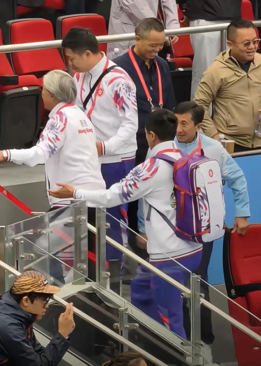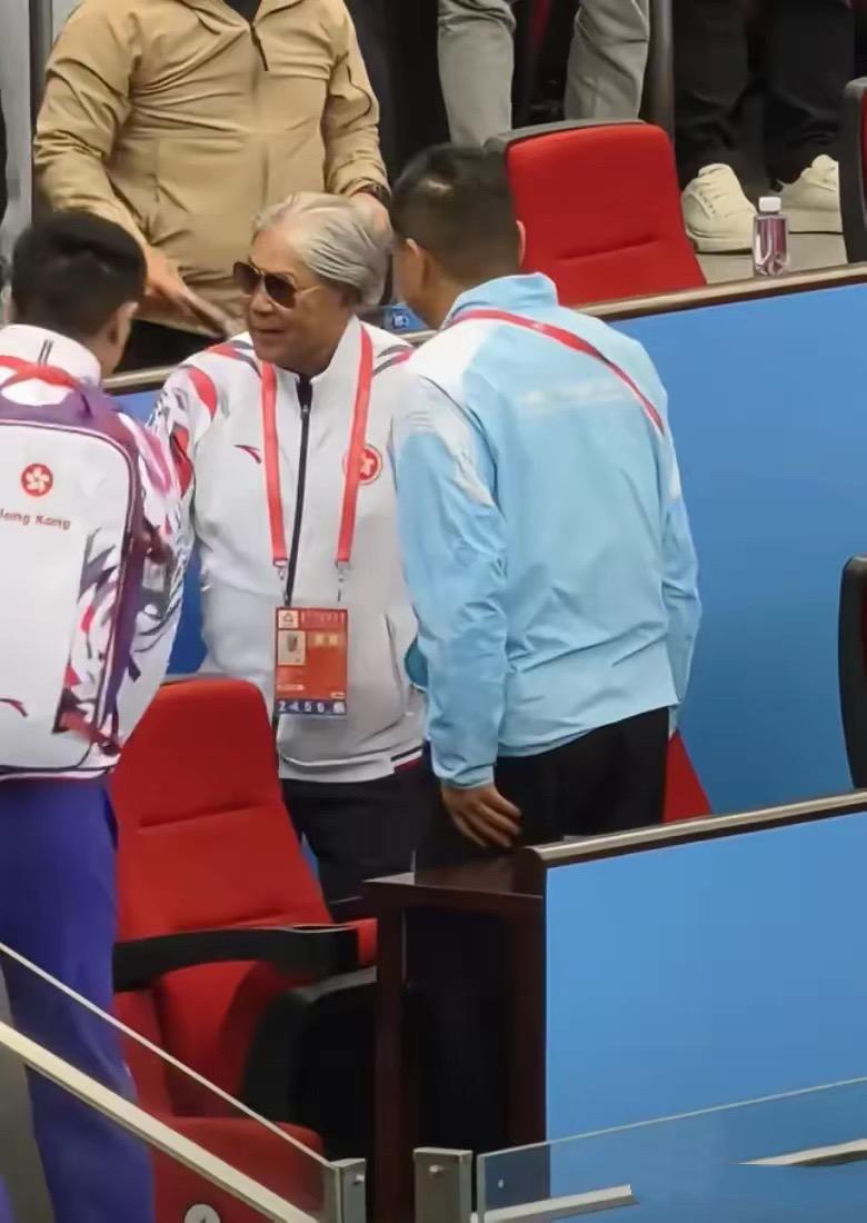 穿着香港隊服,帶着工作證的霍震霆,精神頭很好。他頭髮都花白了,一人精神抖擻。快80歲的老人了,一直都在忙着工作。