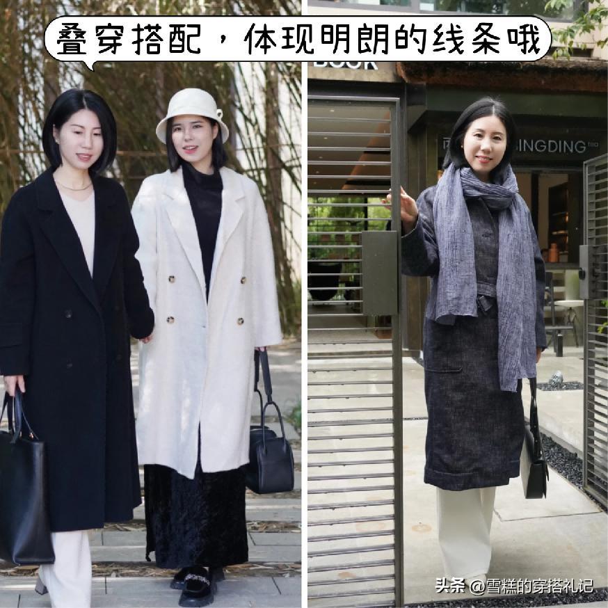 尤其是在秋冬季節選擇大衣進行搭配的時候,難免要運用一些疊穿的方式,但是對於上了年紀的女性來說,我們首先要做到的就是很好的優化我們的身材狀態,推薦大家可以優先於選擇運用線條走向比較明朗比較具有流暢感的內搭單品,尤其是煙管褲,煙管裙這一類是最爲適配的。