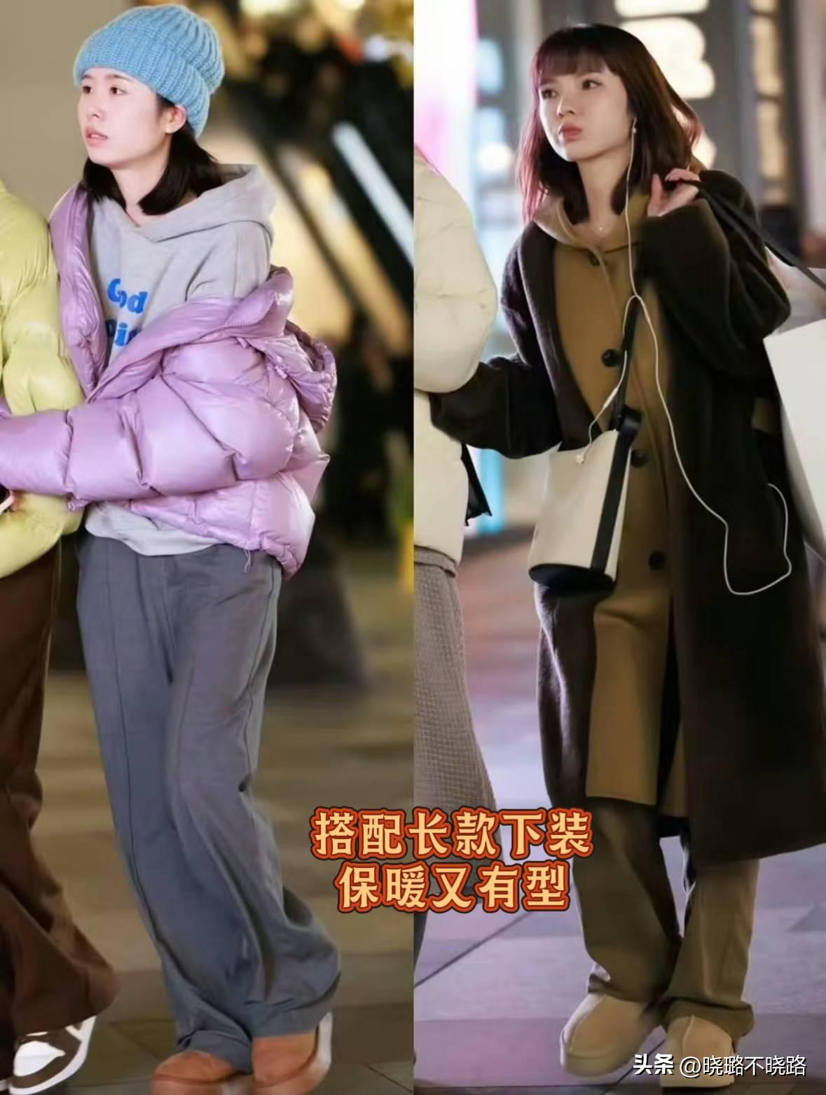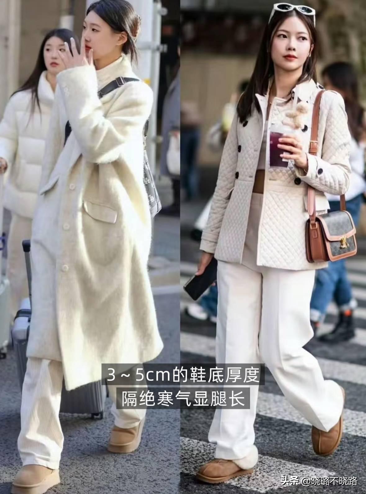 像UGG雪地靴這種量感比較大的鞋子,其實並不建議配太長的外套,例如長羽絨服、長大衣,視覺上都會壓個子,換成短款外套,打造“上短下長”的效果,纔不會顯得笨重。