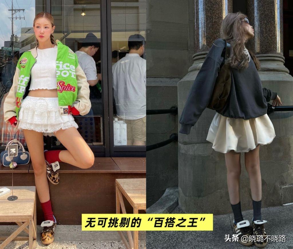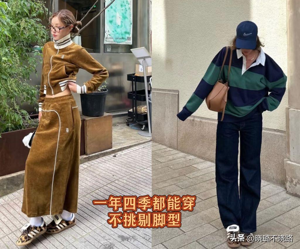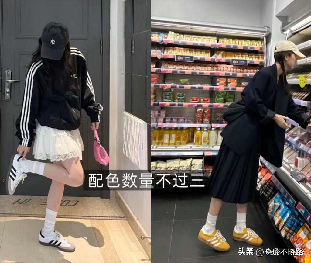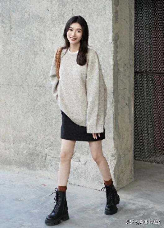 真正會穿的女生,往往會關注到每一個細節處理,比如薄底德訓鞋和短裙的搭配,千萬不要直接露出腳踝,建議搭配一雙有彈力的短襪,天和腳踝位置,既顯瘦又保暖,還能優化腿型。
