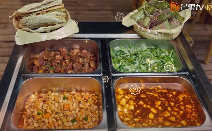 紅燒肉、炒青菜、宮保雞丁、燒豆腐,還做了一道開胃的酸辣燙。怕大家喫不飽,黃磊還特意準備了大餅和糉子。