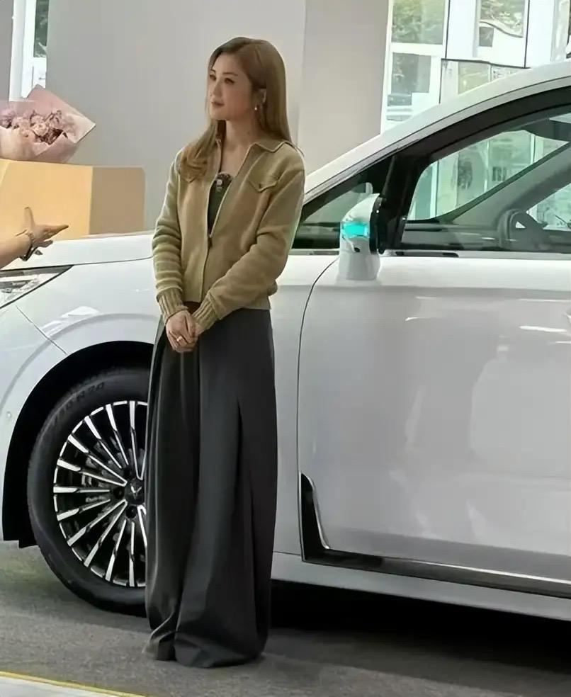 有點嬰兒肥的阿Sa看起來可可愛愛的,完全不像是40+的年紀。她穿着闊腿褲、厚底鞋,站在新車旁拍照,沒有絲毫明星架子。