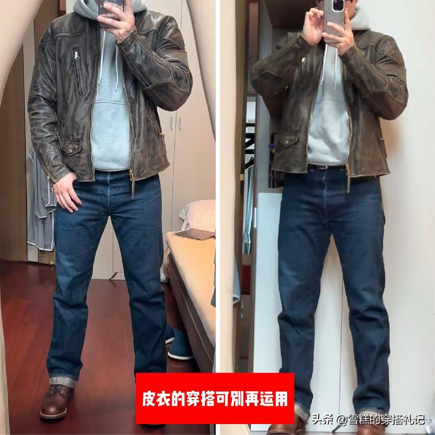 第1種就是皮衣結合闊腿褲這樣的組合搭配,不得不說,對於任何一類身材狀態的男性而言,這樣的組合穿搭都非常容易顯得很有臃腫感。所以如果你本身的身材狀態就比較胖,又或者是小贅肉比較明顯的話,就千萬不要運用這樣的穿搭了喲。