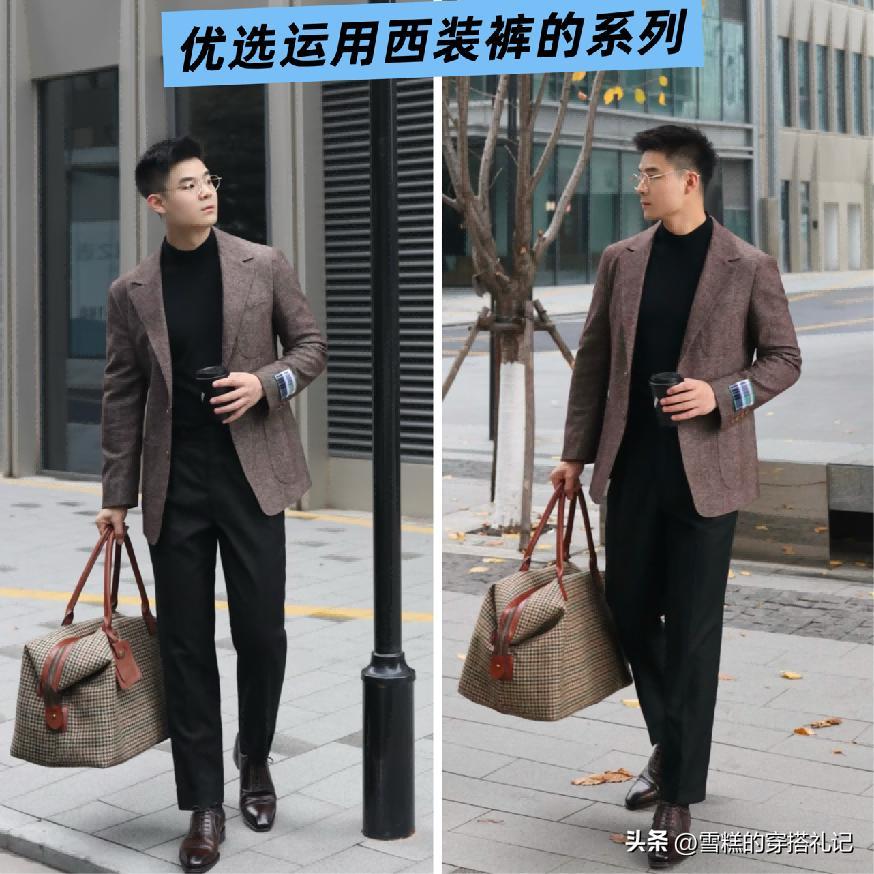 毛呢西裝所稱得出來的利落感和高級感會比較明顯一些,所以比較適合將其進行組合的,當然就是很配套的西裝褲了,版型的狀態可以略微寬鬆一些,但一定要保證自上而下的輪廓是屬於有利落直筒的款式。展現出來的氣質狀態是非常極具優勢的,對於每個年齡階段的男性而言都很適配。