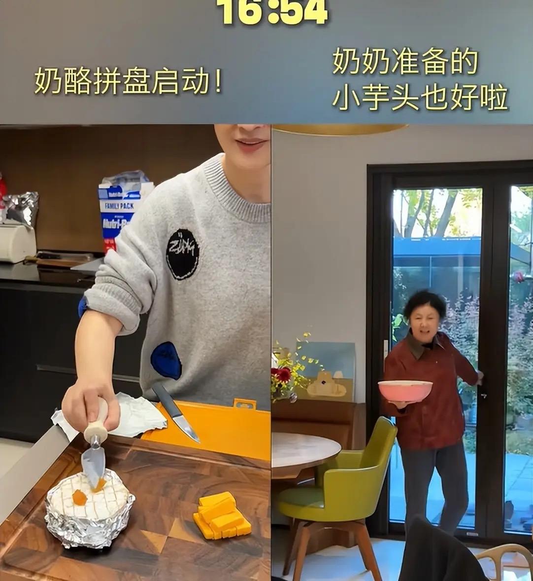 家裏的菜板,也是實木的、看着就很有格調。甚至做菜用到的各種道具、以及廚具,都非常講究。而且梅婷家裏非常暖和,兒子直接穿着背心和短褲,跟奶奶一起忙碌,側臉看着像爸爸。