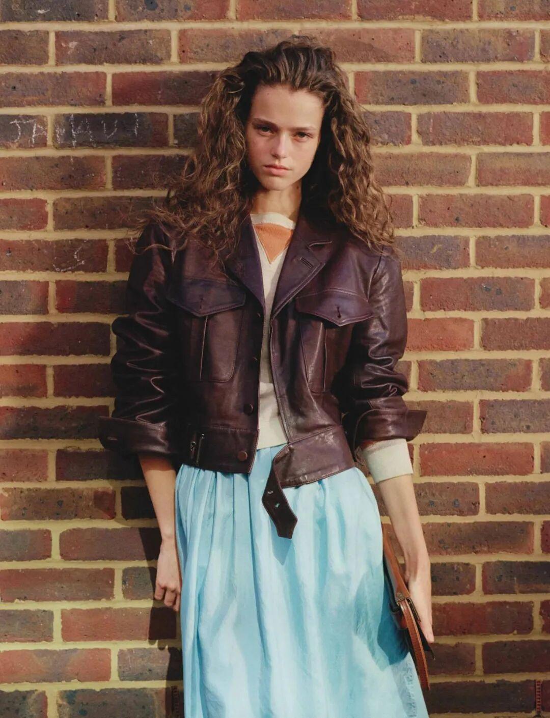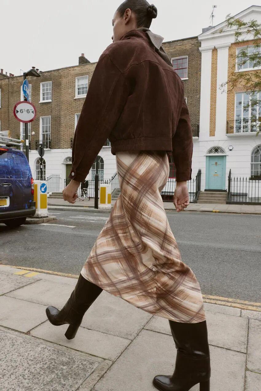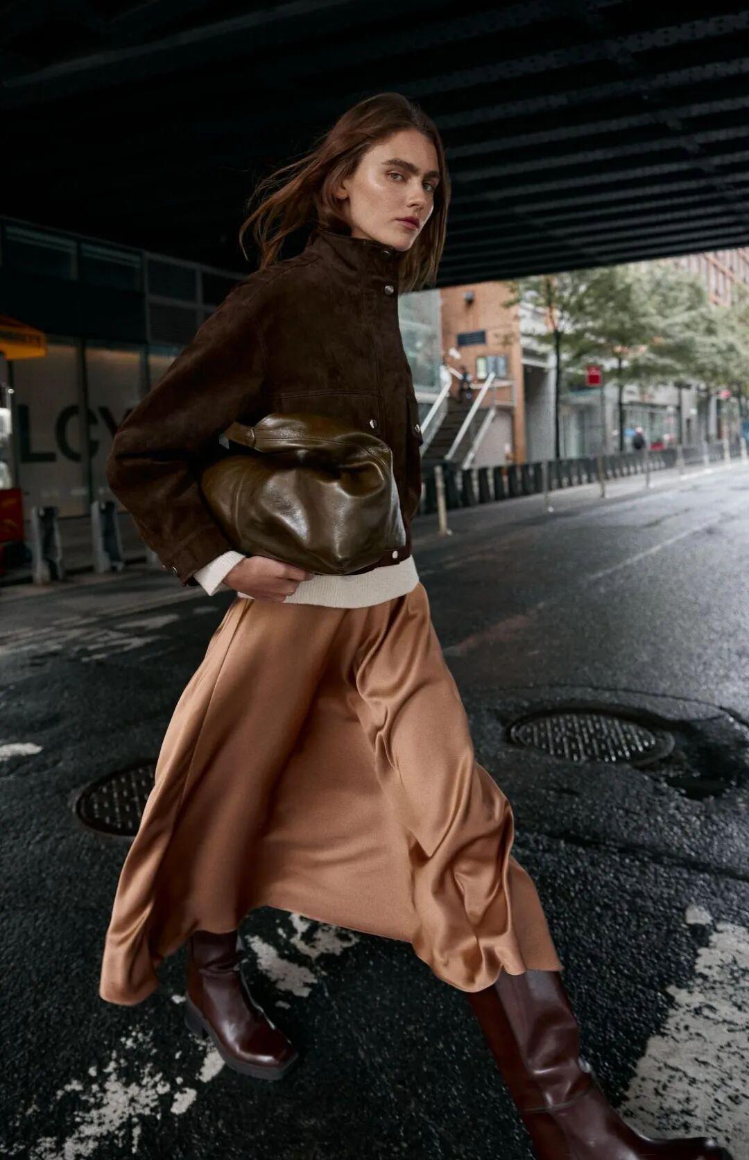 麂皮短夾克利落帥氣,能巧妙平衡緞面裙的柔美。棕色的包包和靴子也增加了整體厚重感。▼