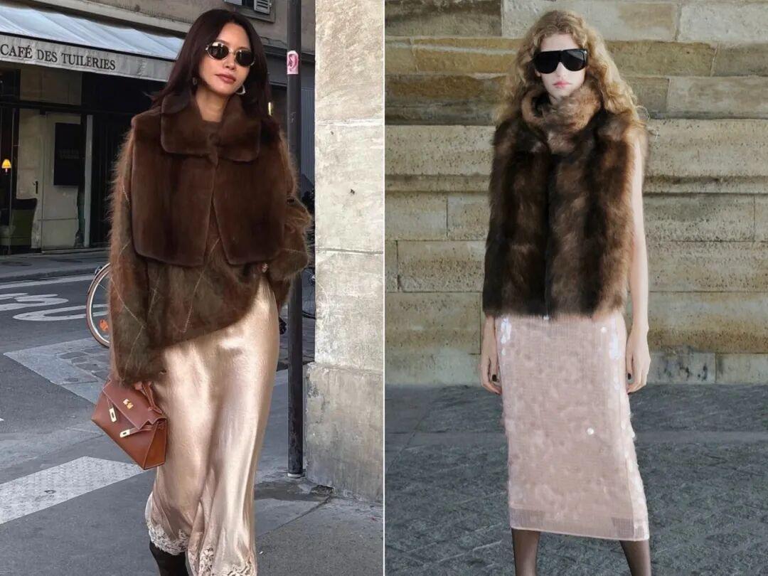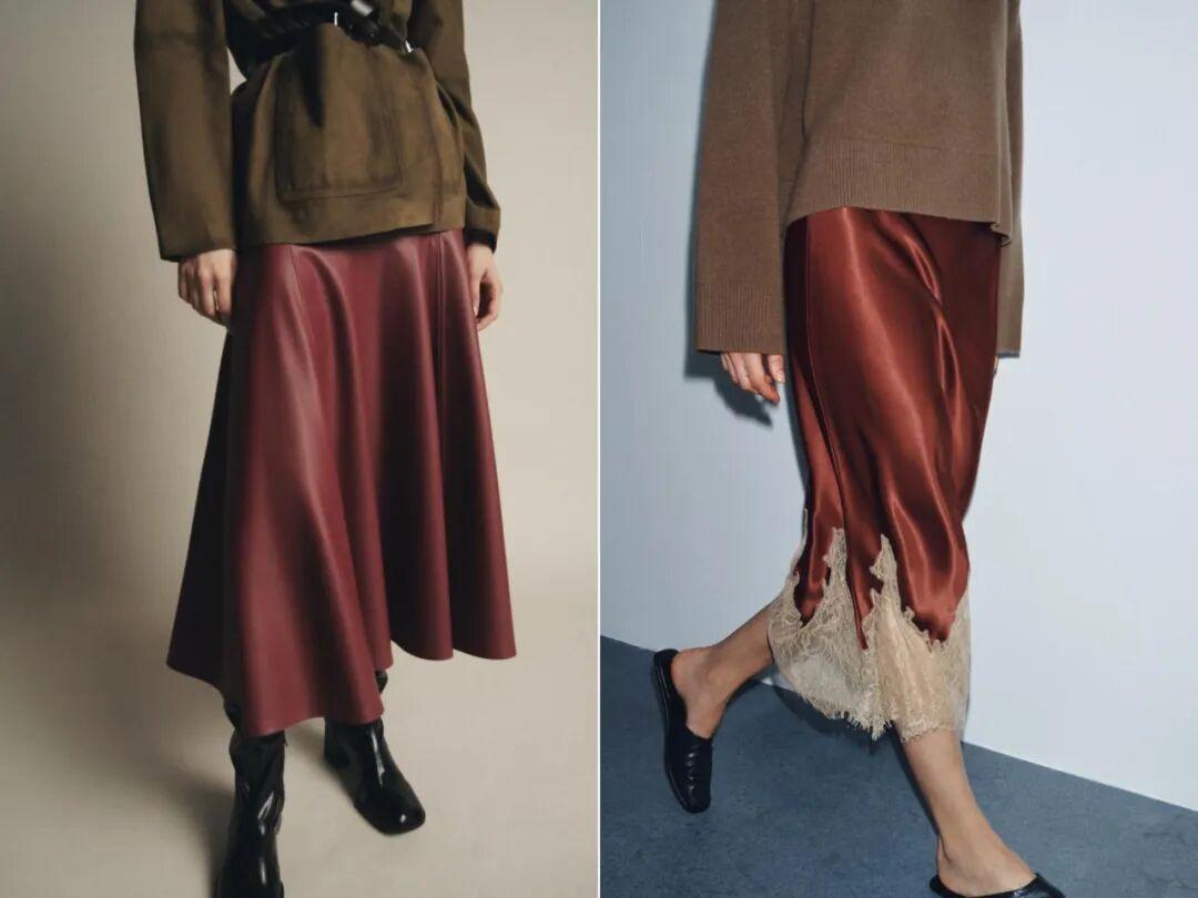 如果你喜歡更亮眼的組合,不妨試試棕色皮衣+橙紅緞面裙,兩種材質都自帶光澤,搭在一起很吸睛。▼