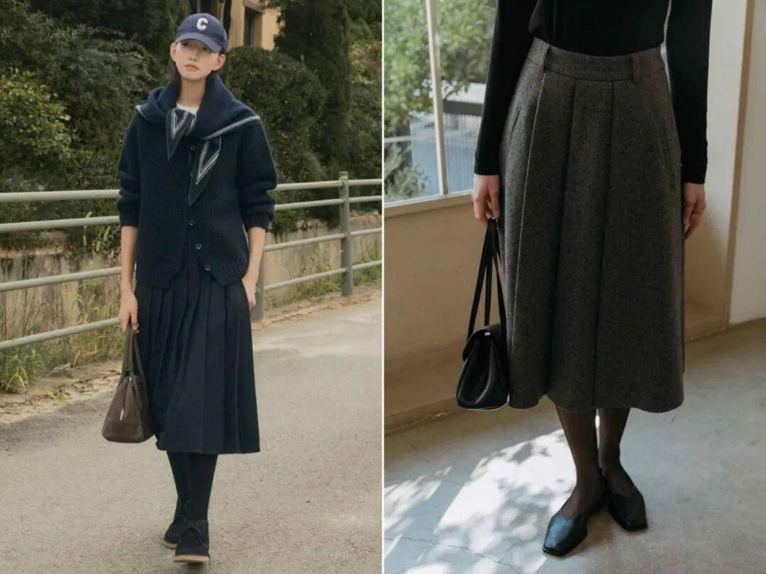 挺括毛呢裙(左)vs 比較挑人的針織裙(右)▼