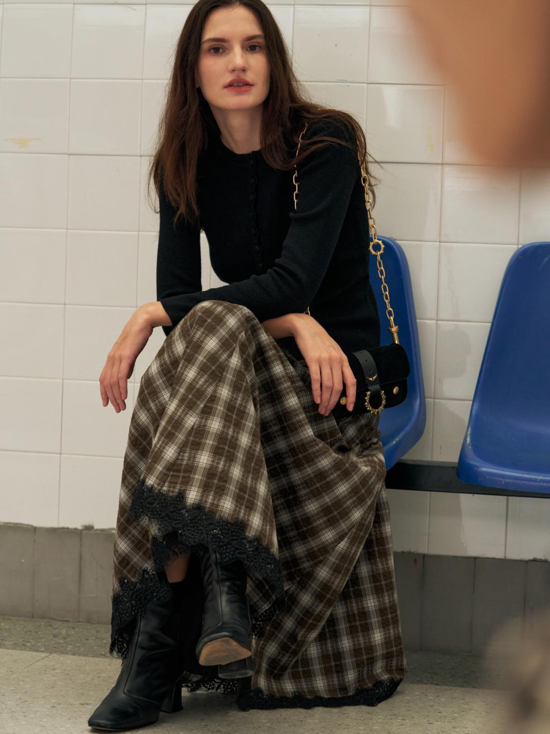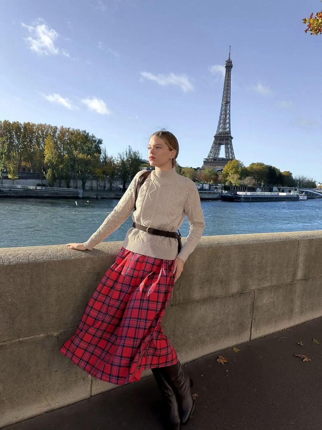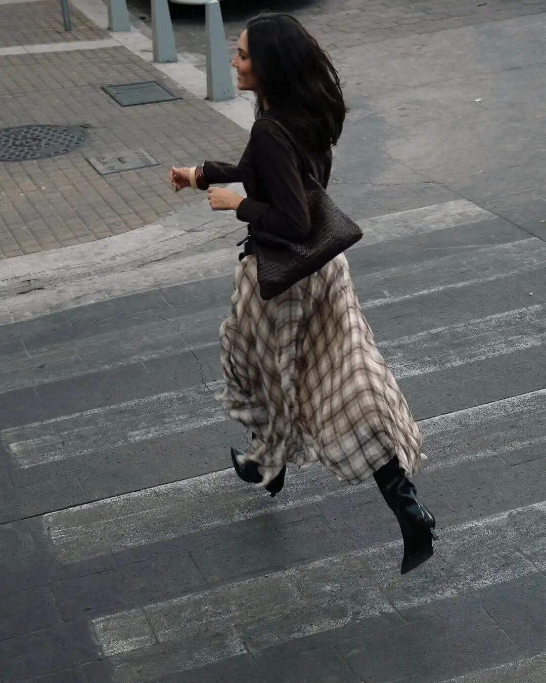 薄紗格紋裙的柔美和黑色長靴的硬朗利落,剛好形成了一種材質和風格的對比。▼
