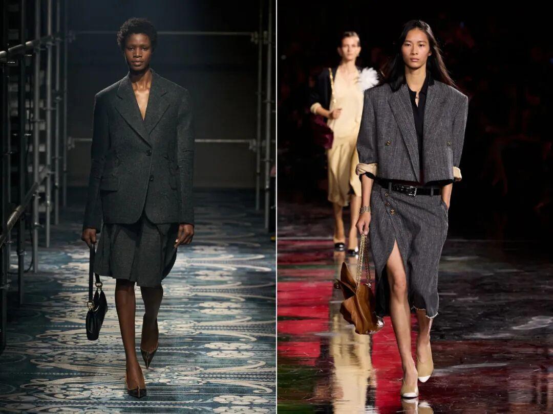 Prada24/25秋冬系列中的褶皺和結構設計(左),香奈兒2026 春夏時裝週上Matthieu設計的灰色羊毛鉛筆裙(右)。▼