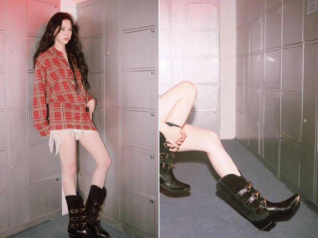 想更貼近Grunge風格的話,可以像歐陽娜娜一樣,選帶鉚釘、金屬扣等細節的靴子,叛逆感立刻拉滿。▼