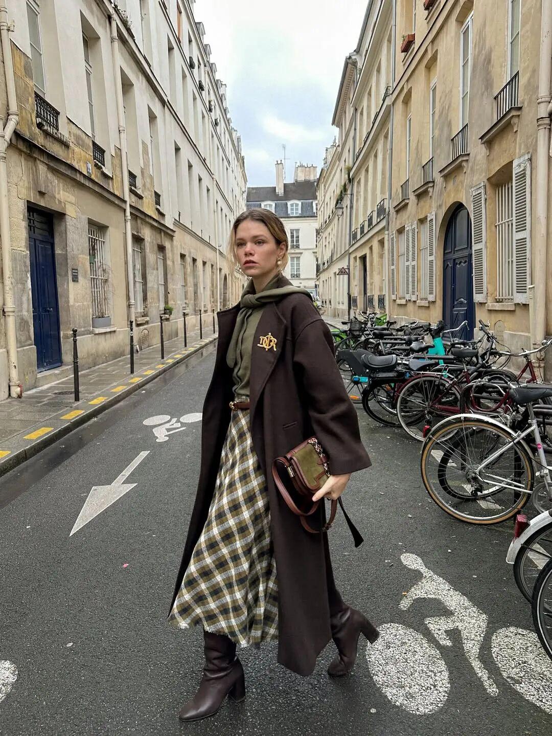 鉛筆格紋裙+及膝長靴:復古通勤風