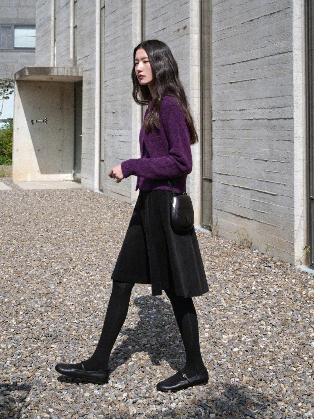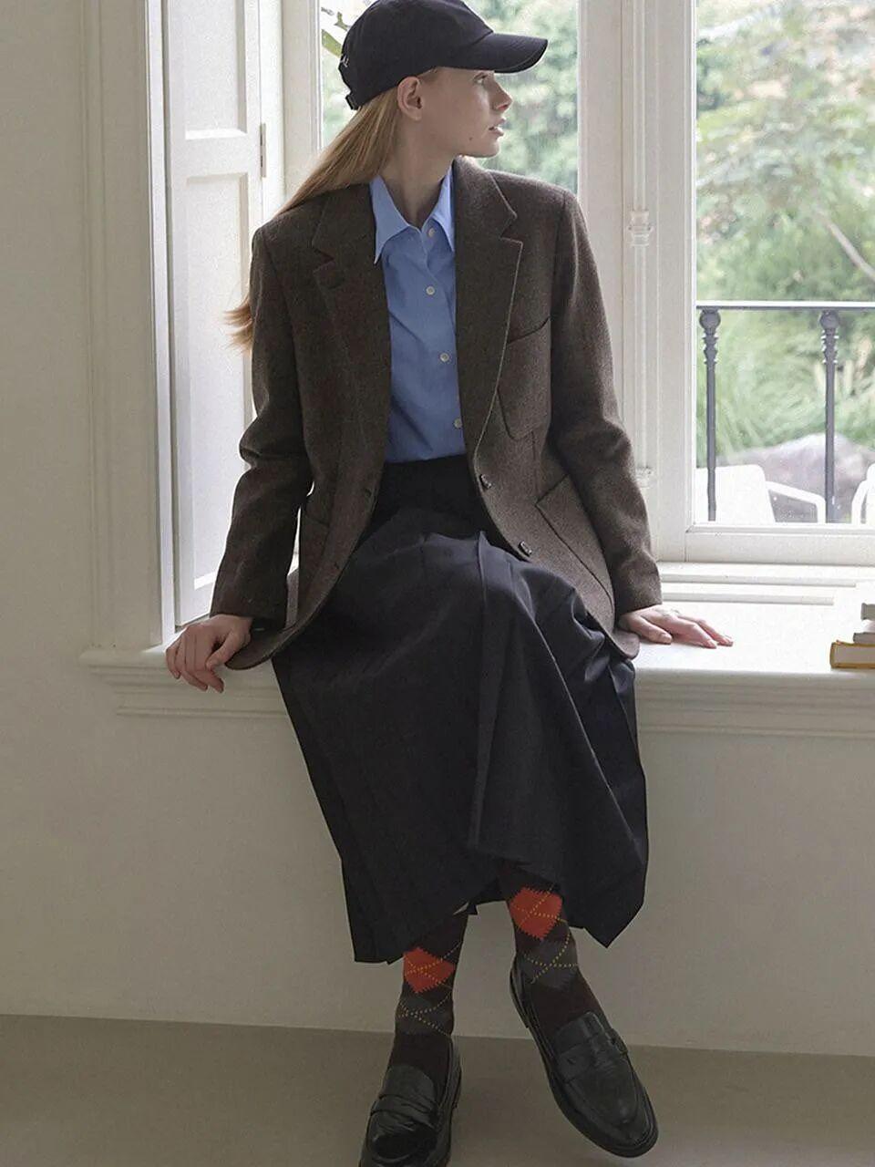 灰毛呢裙+酒紅褲襪+棕色樂福鞋,更復古。▼