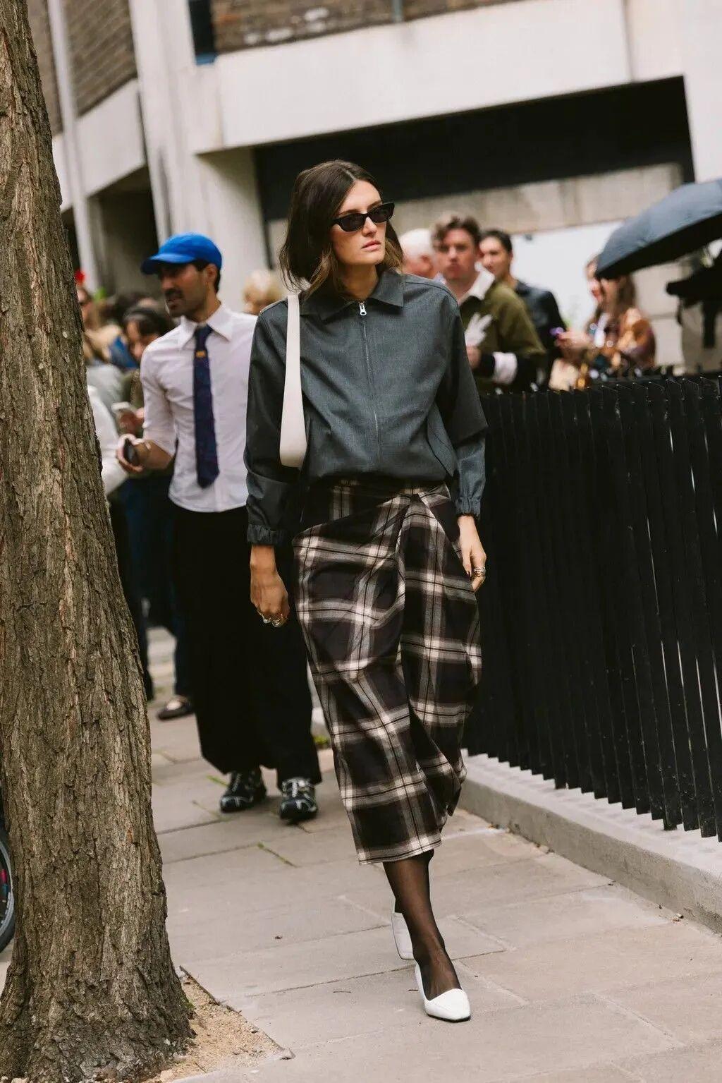 剪裁利落得體,有通勤需求的朋友:選條威爾士親王格紋裙,再搭件西裝就能直接走進辦公室。 ▼