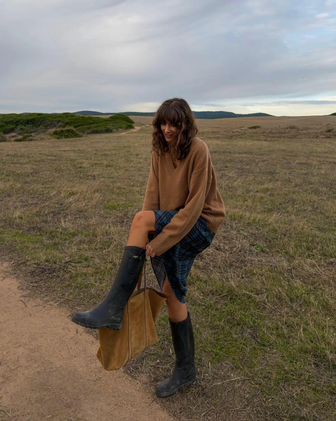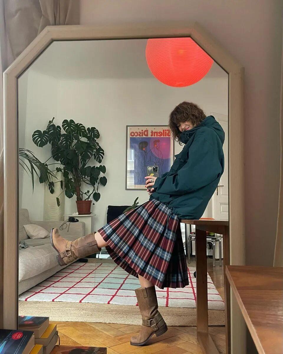 靴子推薦選酷一點的機車短靴/切爾西靴,能突出腳踝線條,和寬鬆的格紋裙形成鬆緊對比,利落有型。▼