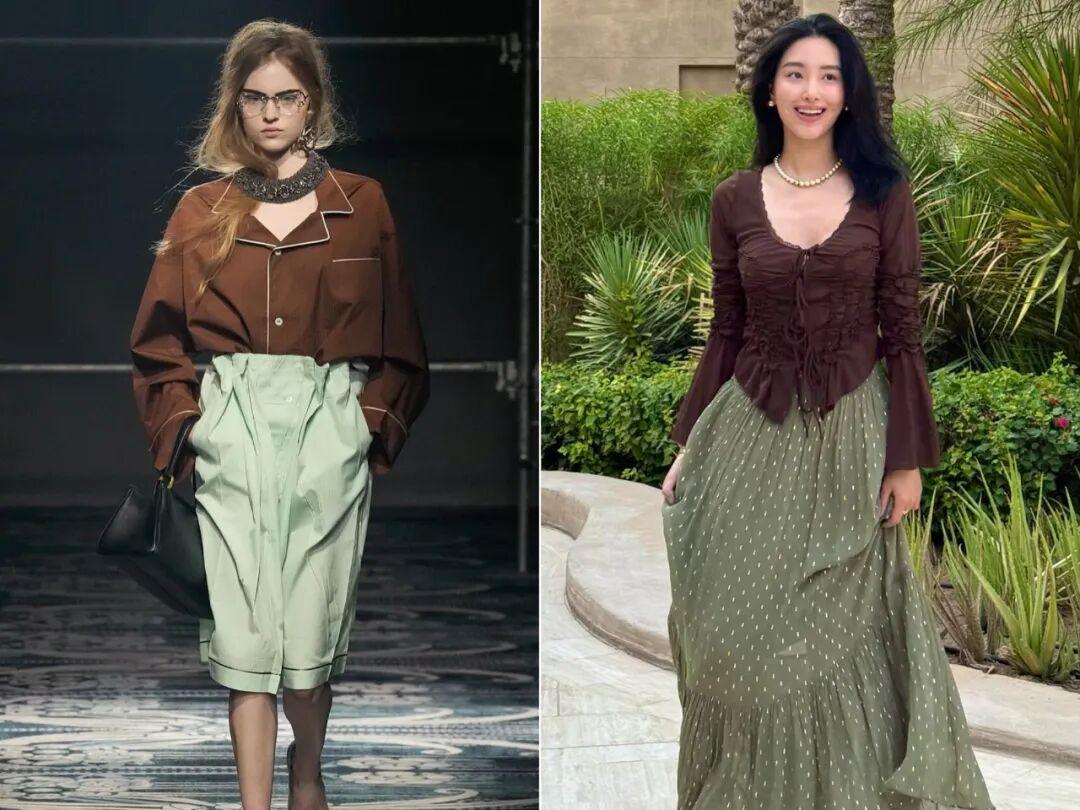 Prada25/26秋冬大秀的棕+薄荷綠,真的讓人眼前一亮(左)。楊採鈺10月初也穿過棕+綠紗裙去度假,飄逸靈動。▼