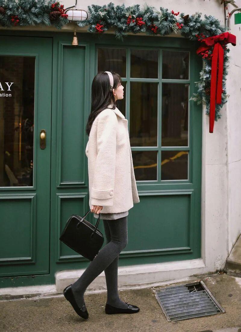 羊毛或混紡的毛呢面料厚實擋風,加上褲襪等於雙重保暖護體。南北方的朋友可以根據溫度,自由選擇褲襪的厚度。▼