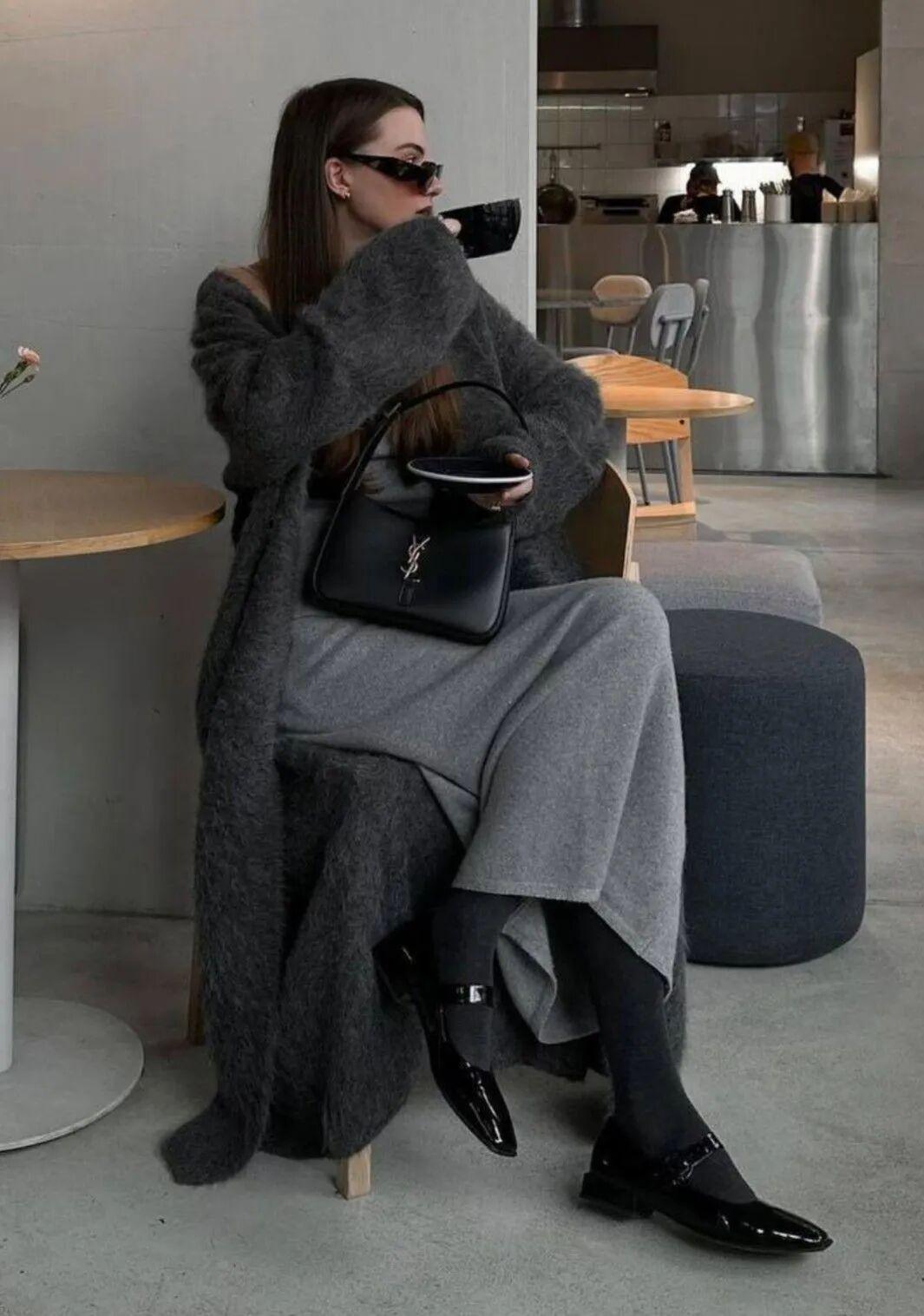 又或者褲襪和裙子選同色, 比如灰色毛呢裙+深灰褲襪,有種視覺無限延伸的感覺。▼