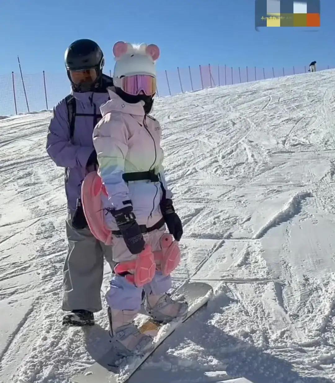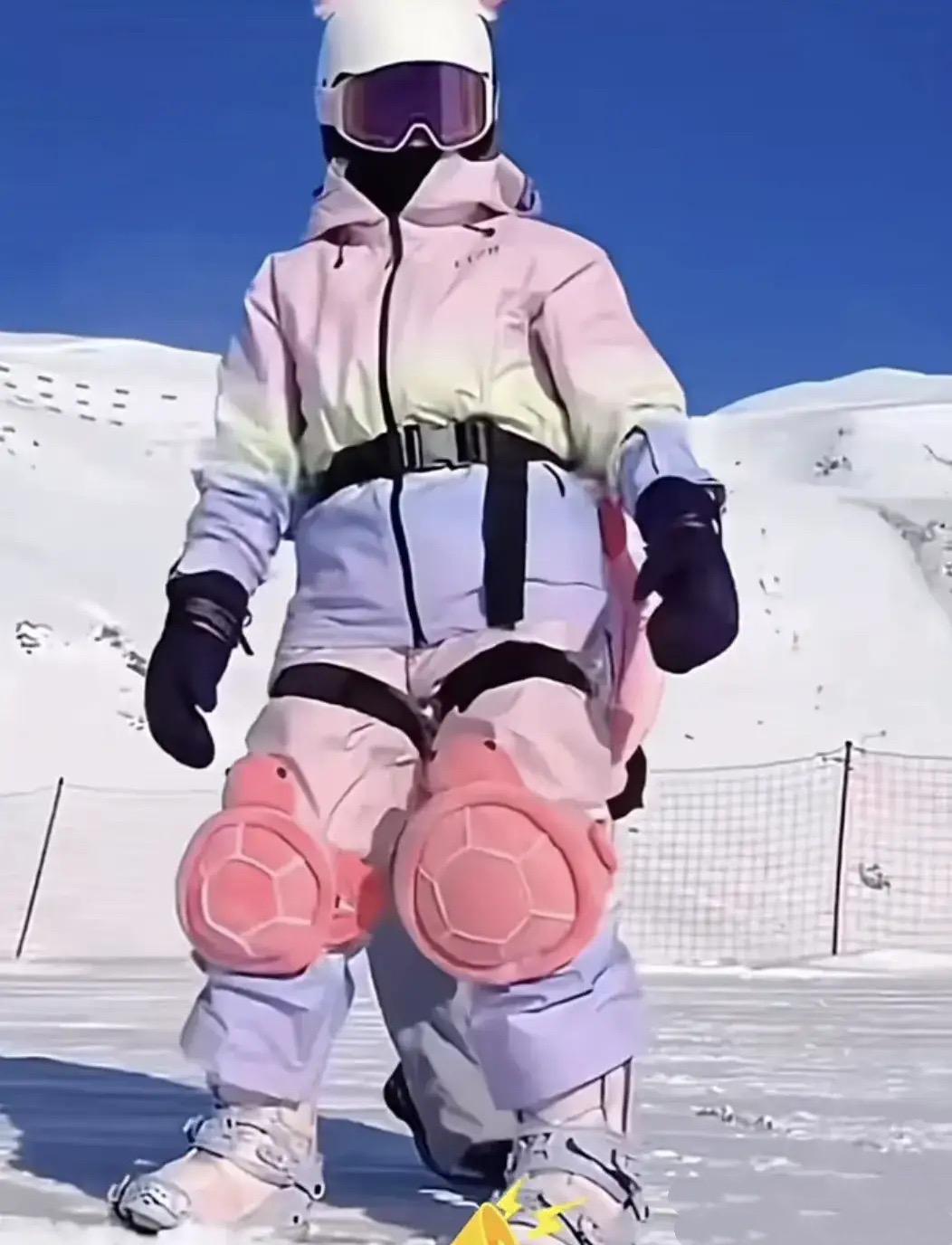 來到新疆之後,全紅嬋體驗了心心念唸的滑雪運動。她穿上了粉紫漸變的滑雪服,帶着米白色的針織帽,膝蓋上綁着可愛的小烏龜墊子。