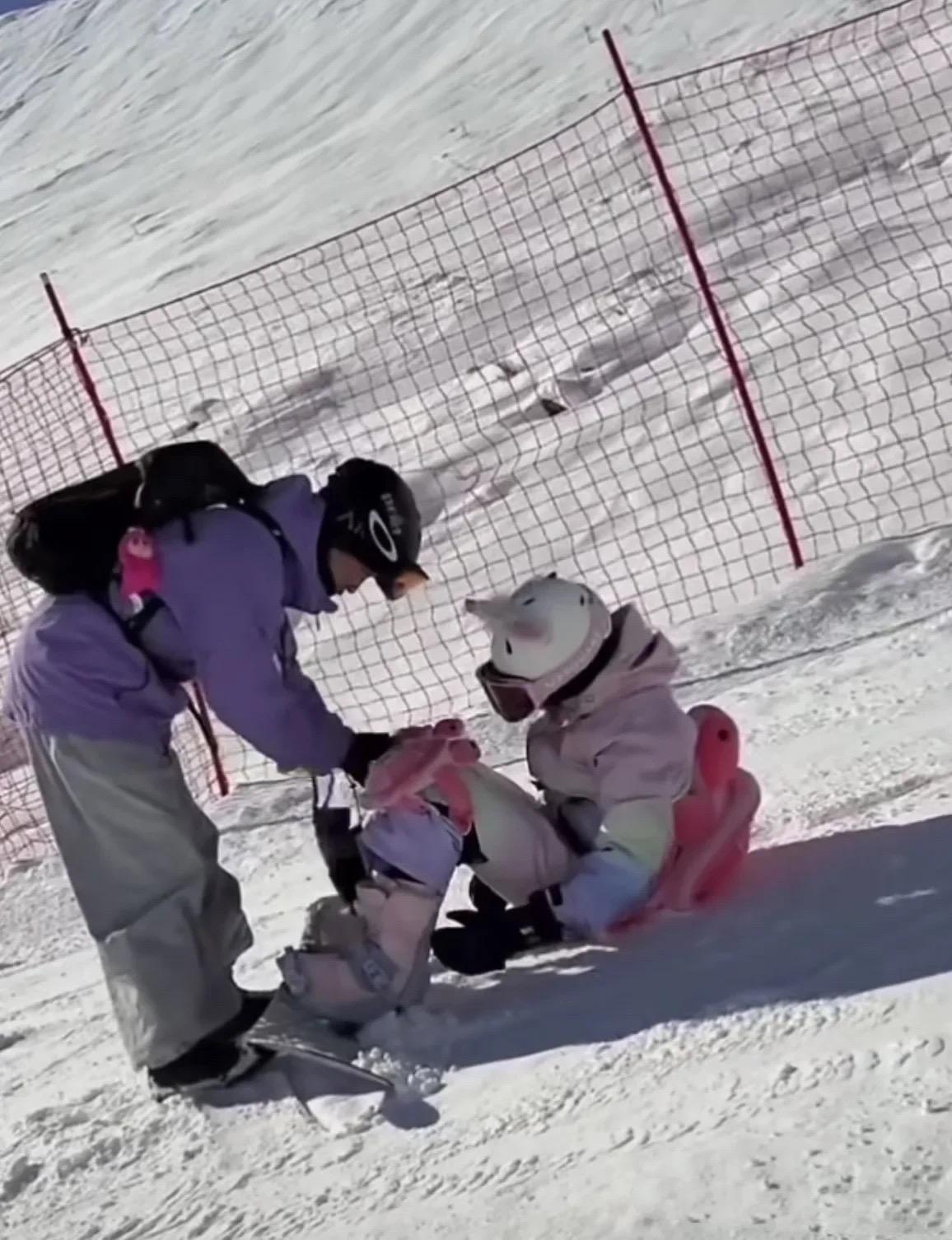 雖然全紅嬋已經18歲了,可是在滑雪教練跟前,還是小小的、看起來就像個孩子。因爲是初次嘗試滑雪運動,全紅嬋也是坐在了準備。雙腿的膝蓋上都裹裹着小烏龜的墊子,屁股上也是小烏龜墊子。