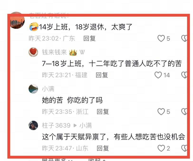可在視頻的評論區,依然有一些“不協調”的言論,讓人覺得反感。比如有人說“14歲上班,18歲退休,太爽了!”