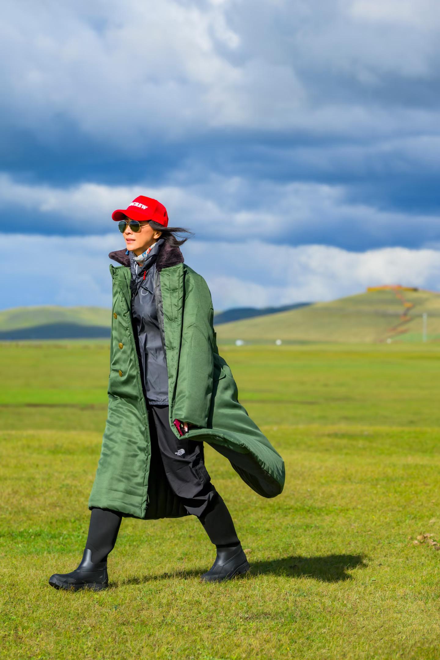 要說劉嘉玲,在上綜藝的時候可是一點明星包袱都沒有。他穿着軍大衣、踩着厚底靴,大步流星的走在草原上,這狀態也太颯了吧。