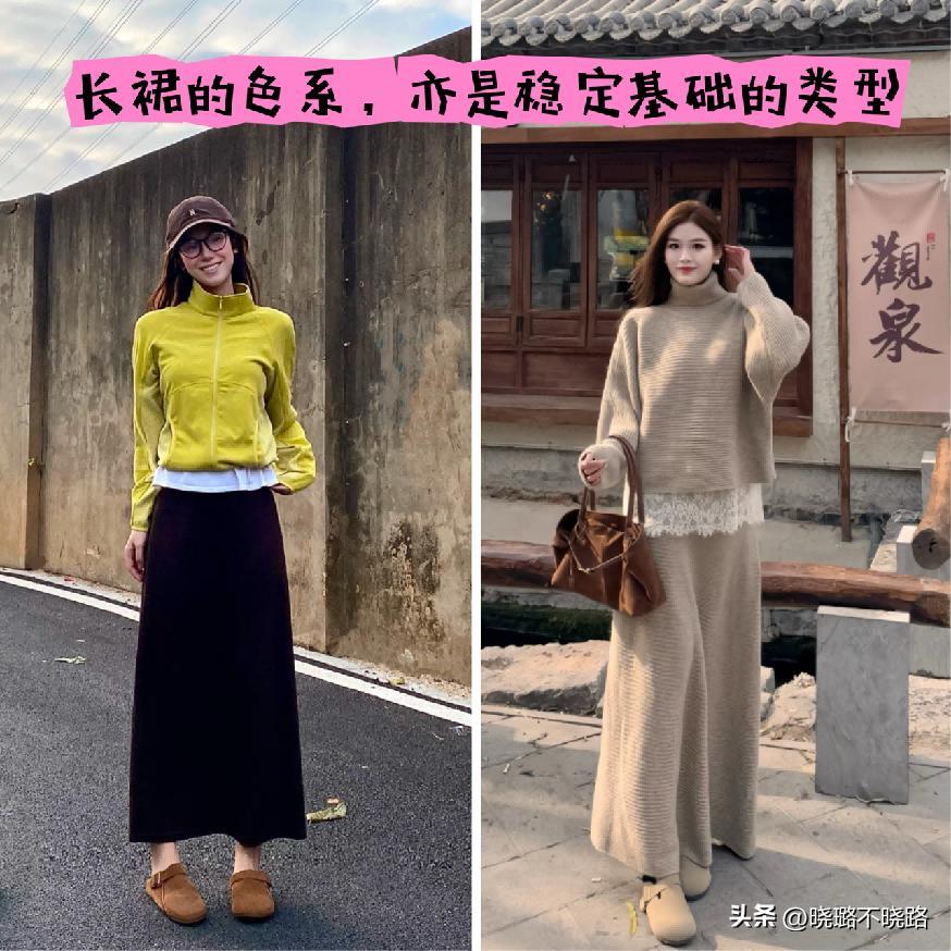 裙子的色系其實就更推薦各位可以優先於運用比較基礎的顏色,又或者是飽和度較低一些的色系,整體搭配呈現出來的穩定度是最高的,如果你的腿部比較粗壯的話,那麼你的長裙就可以選擇偏暗一些的顏色,因爲這樣的色系不僅可以很明顯的勾勒和優化我們的線條走向,也能夠起到非常明顯的顯瘦效果。