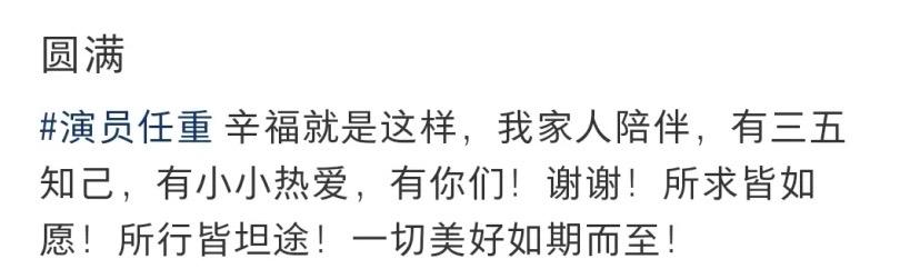 他說幸福就是這樣,我家人陪伴、有三五知己、有小小熱愛、有你們!所求皆如願、所行皆坦途,一切美好如期而至。