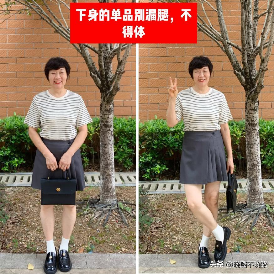 可以看一下這一組踩雷的搭配,已經到了五六十歲這個年齡階段的時候就推薦各位女性千萬不要再穿短裙和短褲這樣的系列了,露出來腿部的狀態不僅沒有任何的優勢,而且很容易暴露出腿上的不足,最主要的是肌膚裸露過大的話就很容易給人一種很不得體很不優雅的感覺哦!