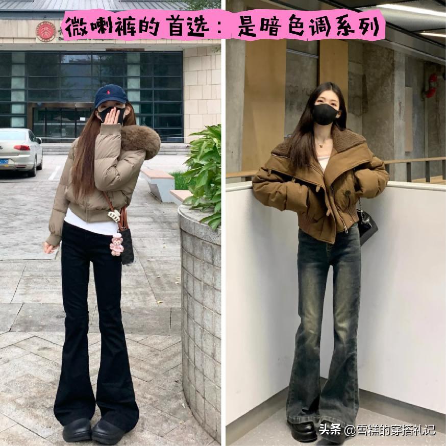 短款的彩色羽絨服穿起來的時候本身時髦和減齡的效果就很明顯,下半部分再搭配一款低飽和度的微喇褲,就比較適合各位年輕的女性在冬季當中進行呈現,真的非常具有個性時髦而且很減齡的效果襯托喲。