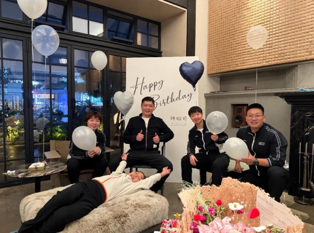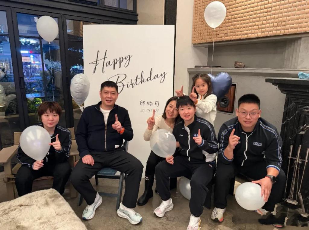作爲邱貽可的得意門生,孫穎莎蒯曼都來了,還有幾位隊員,他們都穿着隊服來給邱指導慶生。孫穎莎坐在最靠近師父的位置,手裏拿着粉色氣球,笑起來特別甜。