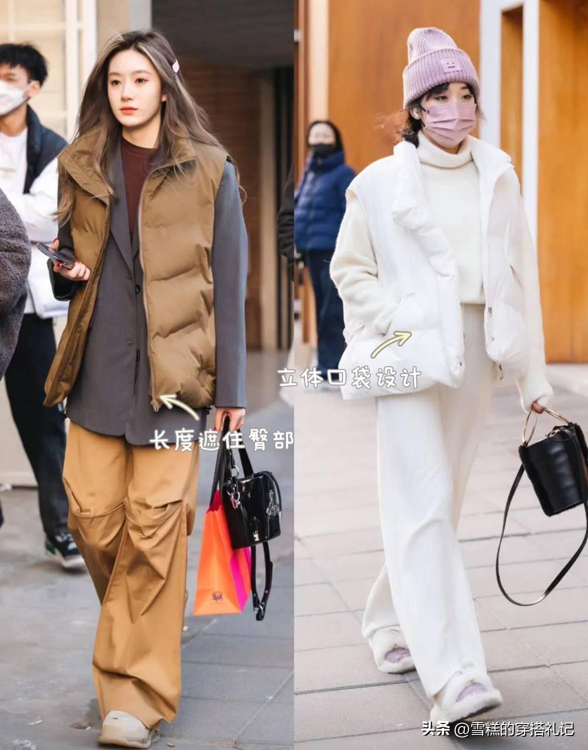 無袖款式的羽絨馬甲,保暖不壓身,穿脫特別方便,還能輕鬆搭出層次感,像這種微廓形的H版與絨馬甲,長度剛好到胯部位置,顯瘦還利落。