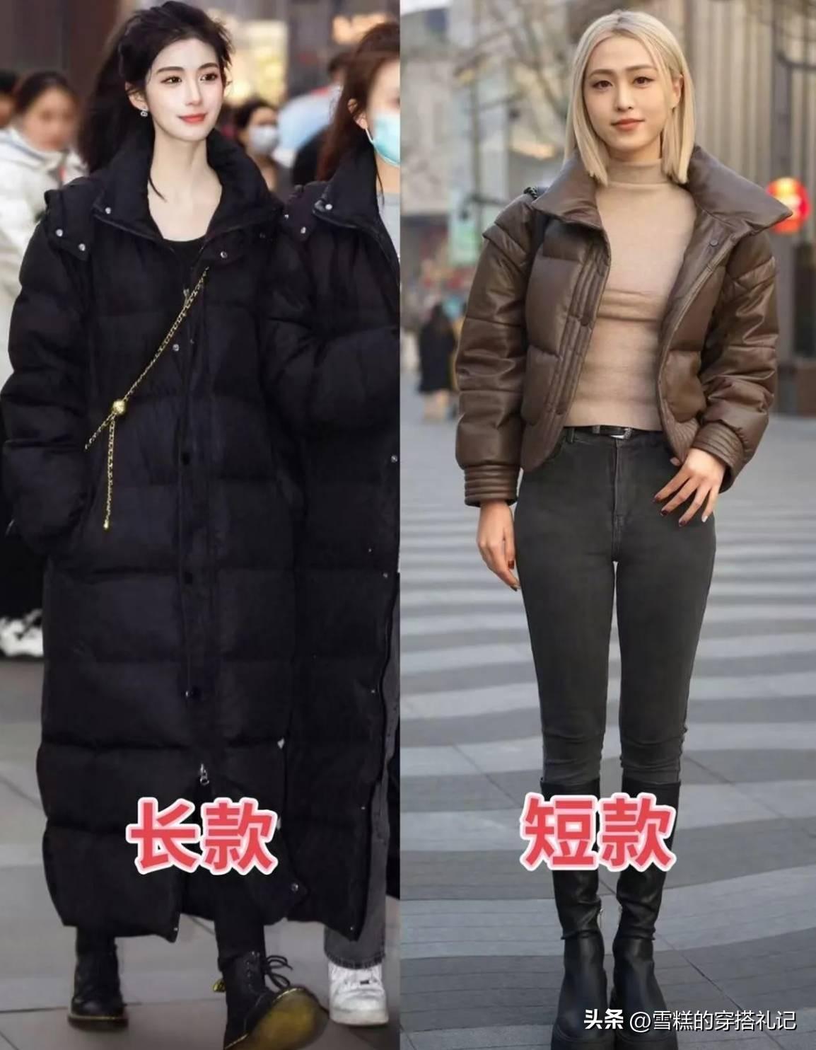 長度剛好遮臀,以及中長款的羽絨服,適合身高在160cm~165cm左右的女生,如果你的個子比較高挑,就可以大膽的嘗試一下遮住小腿的長款羽絨服。