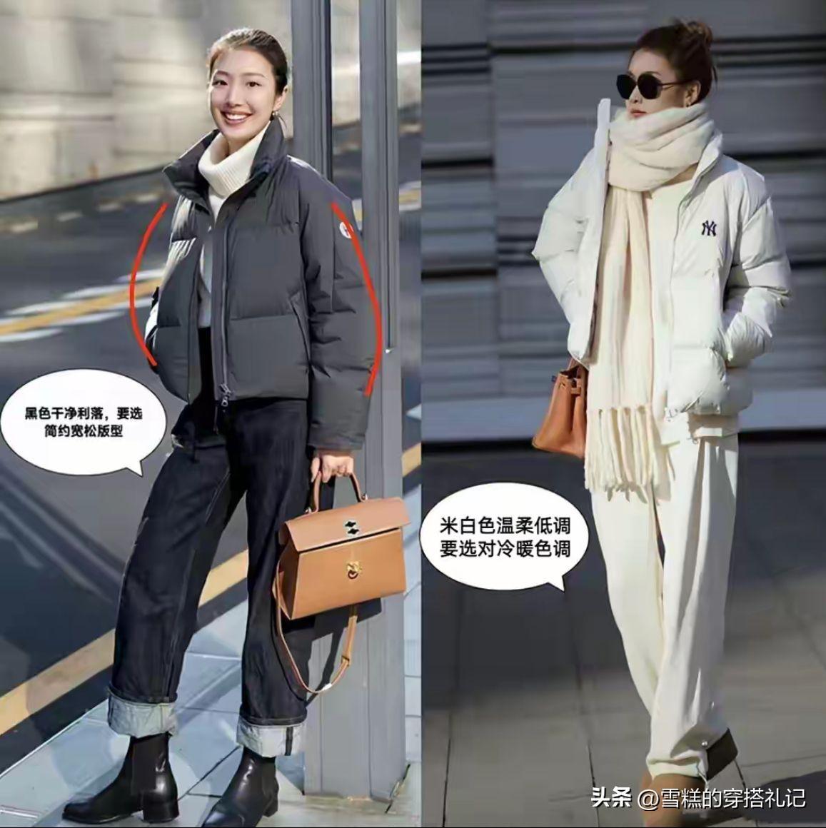 短款羽絨服在冬天非常受歡迎,不壓個子,款式時尚百搭,不過在色彩的挑選上,儘量要以乾淨利落的黑色、米白色爲主,適配度更高。