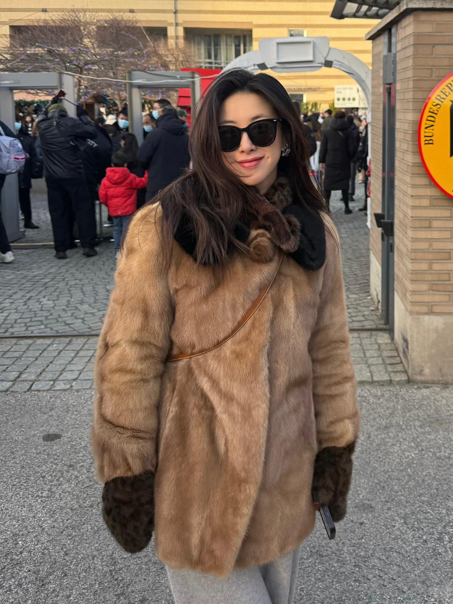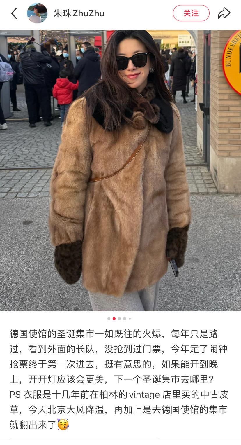 因爲去德國,朱珠甚至找到了10年前在柏林中古店買到的皮草外套。是一件棕色的皮草外套,看着很奢華、也有點顯臃腫,好在朱珠並不胖。