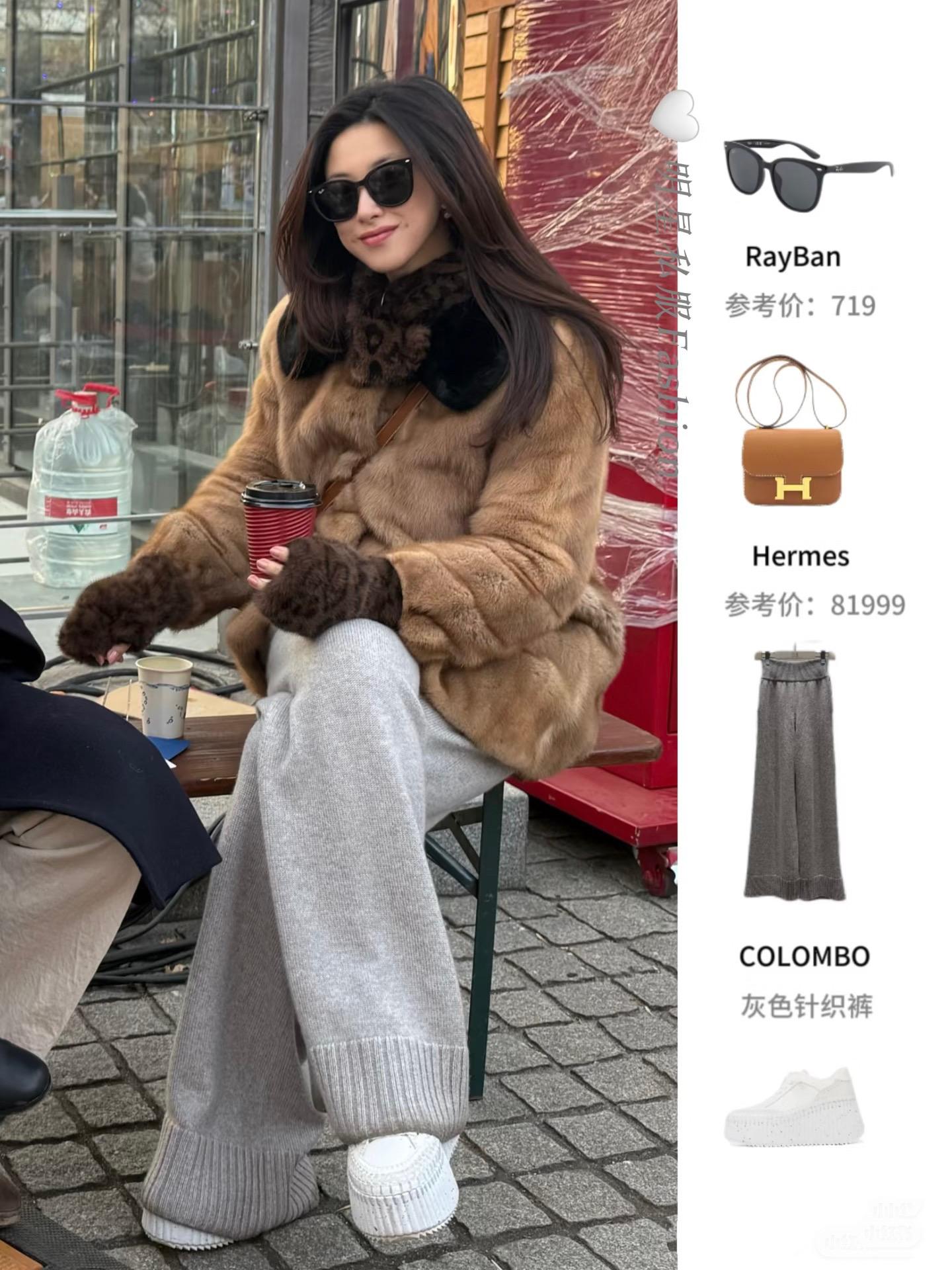 其實朱珠的這身行頭主打一個鬆弛,棕色的中古風皮草外套,愛馬仕的棕色包包,灰色的針織闊腿褲,簡簡單單的黑色墨鏡,很鬆弛也很拉風。
